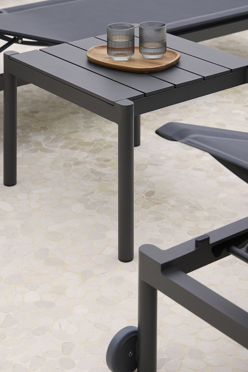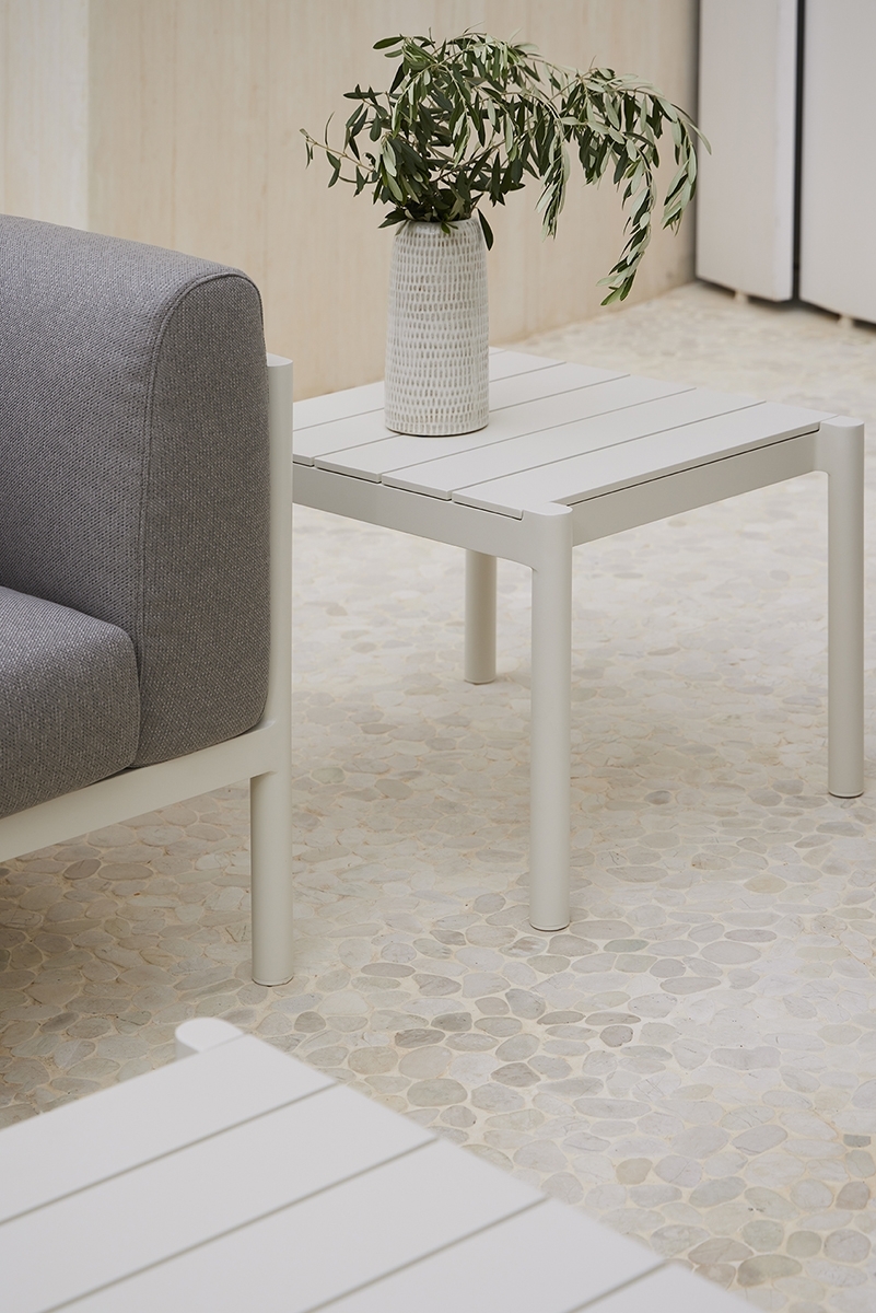 Квадратный столик. Алюминиевая конструкция с порошковым покрытием доступна в кремовом цвете 34. Верхняя часть из алюминия.
