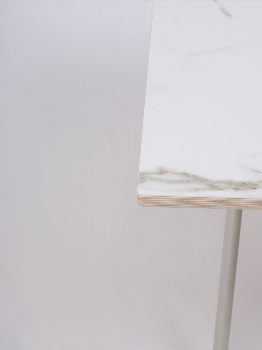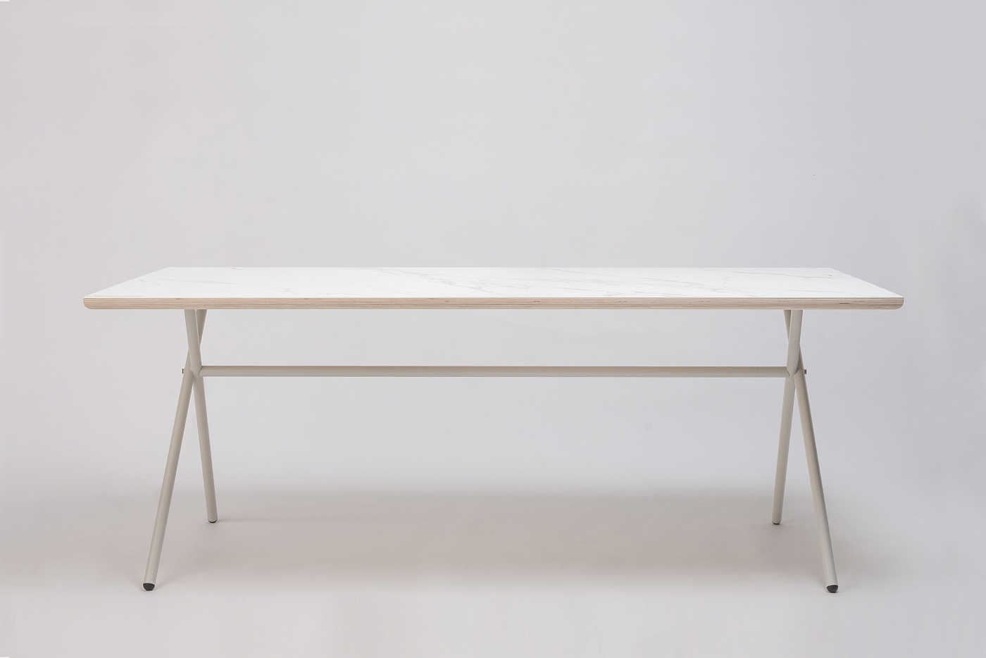 Стол Бай с крестообразными ножками, сохраняющий особенность своего оригинального дизайна. Стальная конструкция, рационалистичная и футуристичная, прибыла, чтобы победить.