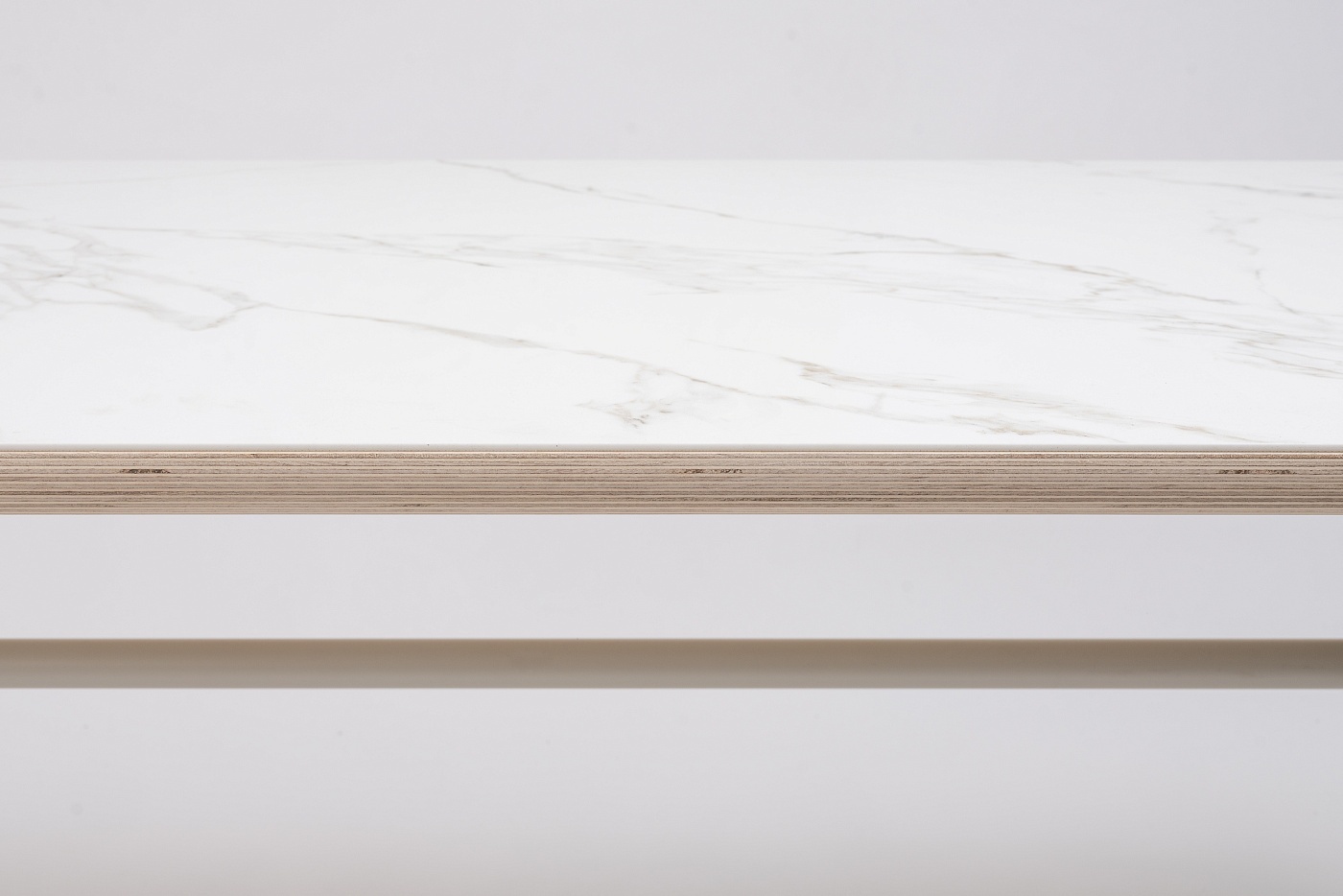 Стол Бай с крестообразными ножками, сохраняющий особенность своего оригинального дизайна. Стальная конструкция, рационалистичная и футуристичная, прибыла, чтобы победить.