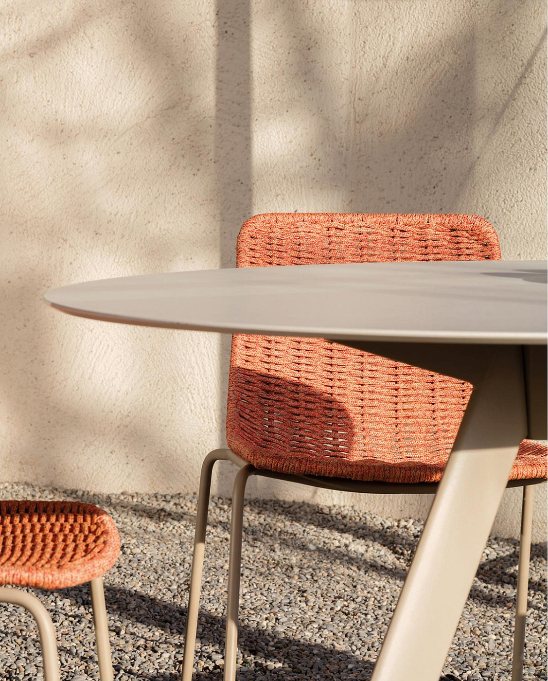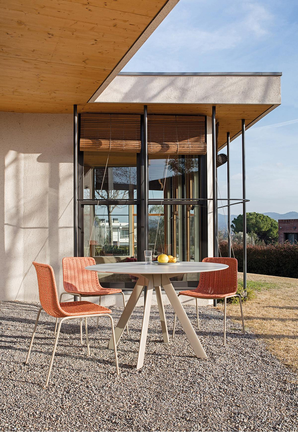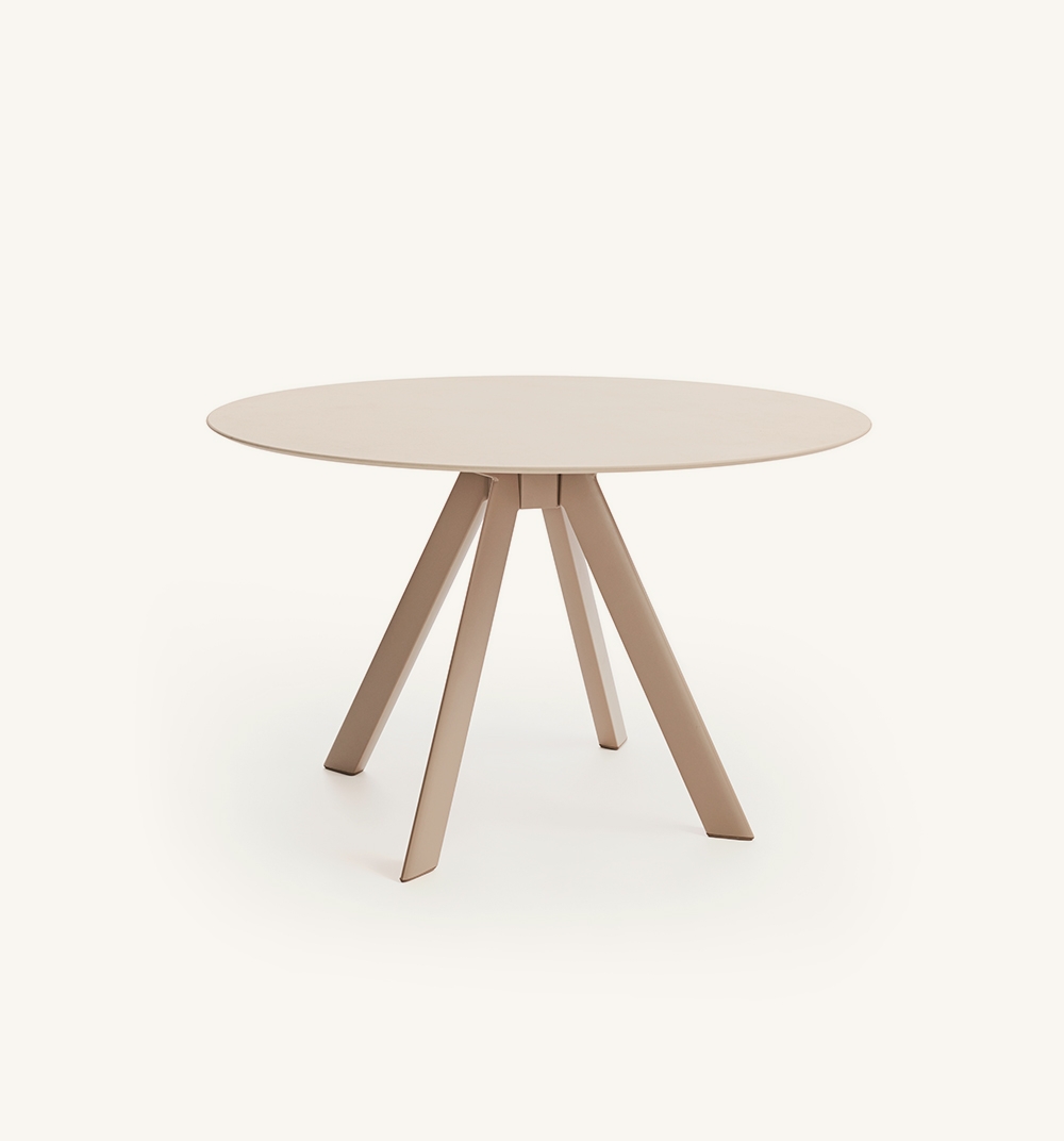 круглый обеденный стол со структурой из высокопрочного алюминиевого профиля и алюминиевых экструзионных ножек, отделанный полиэфирным порошком. Варианты столешницы: HPL Trespa® толщиной 13 мм/0,51 дюйма и Dekton® толщиной 8 мм/0,31 дюйма.