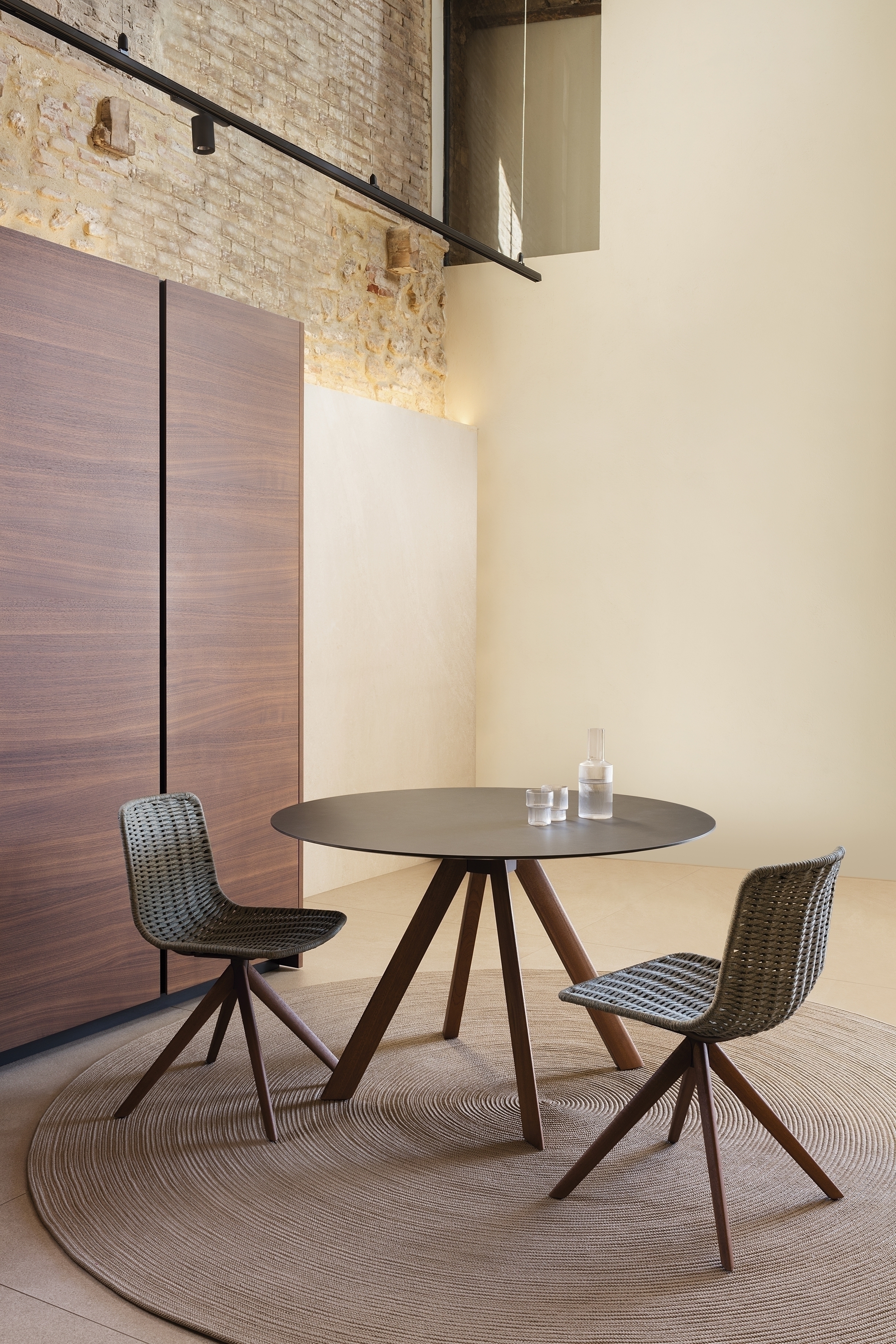 Круглый обеденный стол с каркасом из высокопрочного алюминиевого профиля и ножками из древесины сапеле. Варианты столешниц: HPL Trespa® толщиной 13 мм/0,51 дюйма и Dekton® толщиной 8 мм/0,31 дюйма.