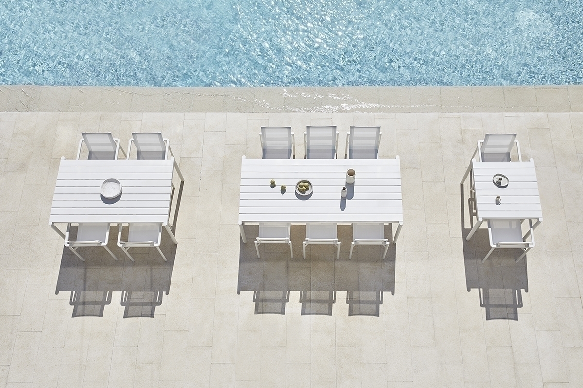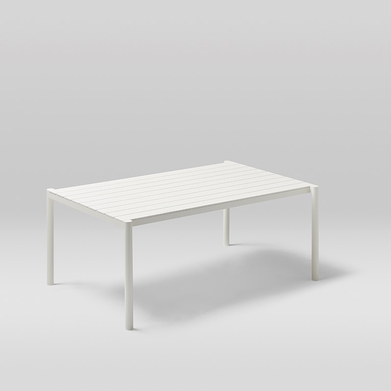Прямоугольный обеденный стол. Алюминиевая конструкция с порошковым покрытием доступна в кремовом цвете 34. Верхняя часть из алюминия.