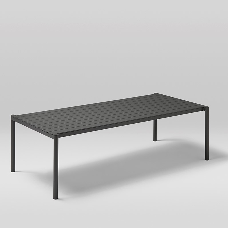 Прямоугольный обеденный стол. Алюминиевая конструкция с порошковым покрытием доступна в сером цвете 56. Верхняя часть из алюминия.