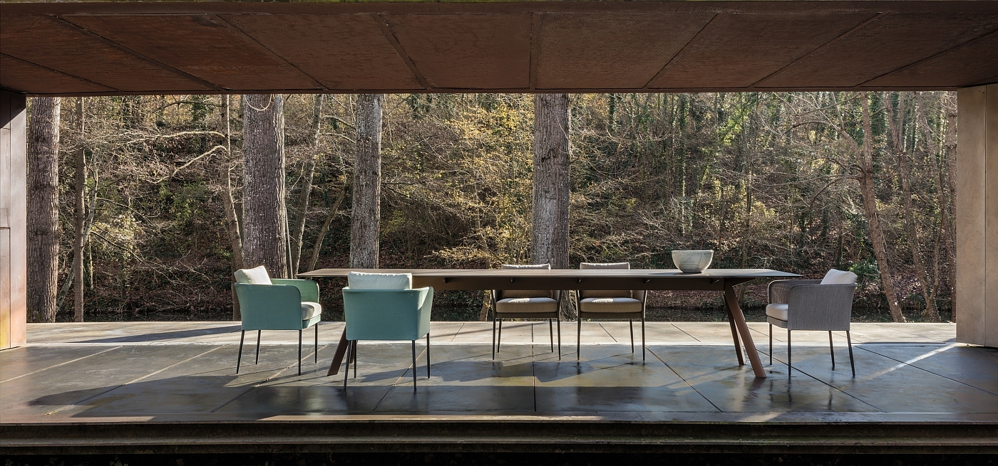 Прямоугольный обеденный стол с каркасом из высокопрочного алюминиевого профиля, отделкой из полиэфирного порошка и ножками из древесины сапеле. Варианты столешниц: HPL Trespa® толщиной 13 мм/0,51 дюйма. Поставляется в разобранном виде.