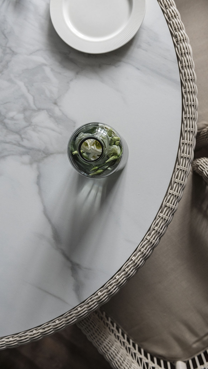 Модель с закруглёнными формами и полупрозрачным кружевным плетением, придающим всей коллекции лёгкость и воздушность. Прекрасный образец смешения двух стилей легко становится украшением пространства как внутри, так и снаружи дома