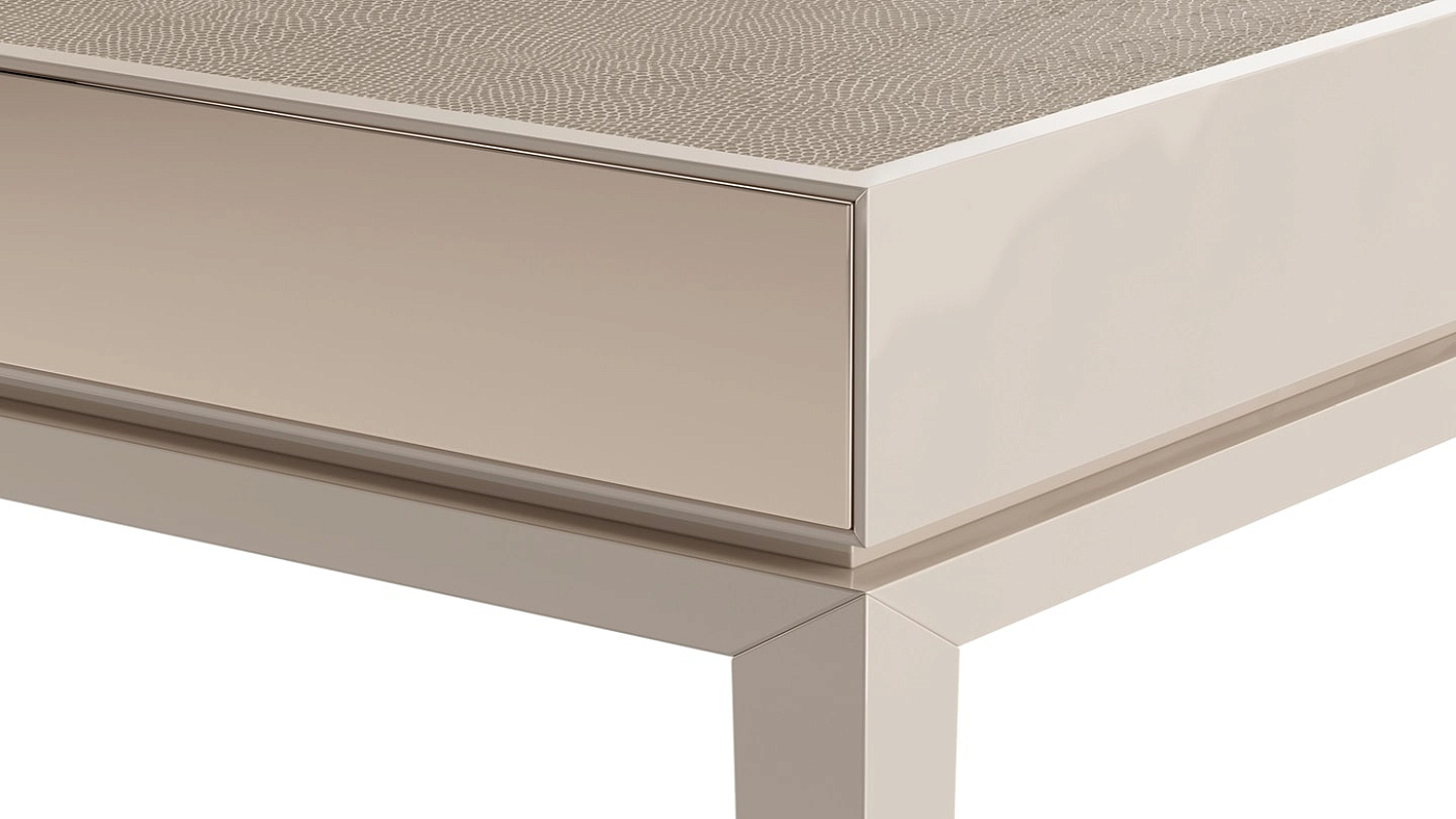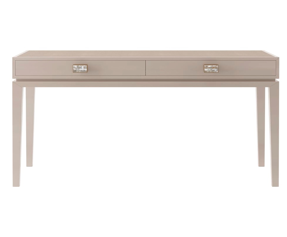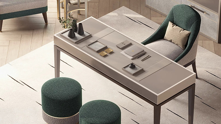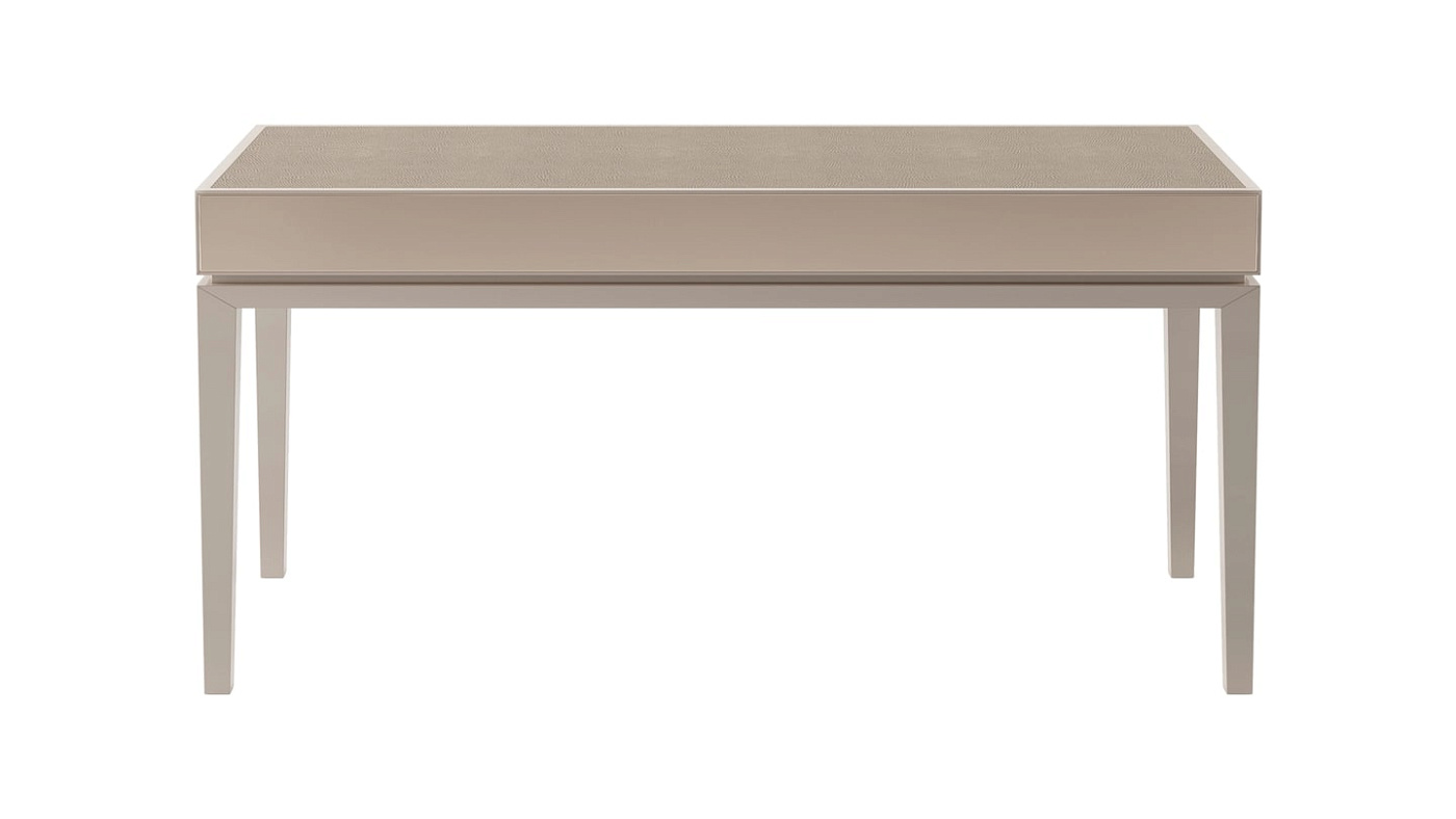 Каким бы обтекаемым он ни был, монотонный письменный стол BUZIOS по-прежнему оставляет место для некоторых дизайнерских излияний. К ним относятся текстурированная кожаная поверхность, бронзовая зеркальная инкрустация сзади и ручки, выполненные из черного перламутра.