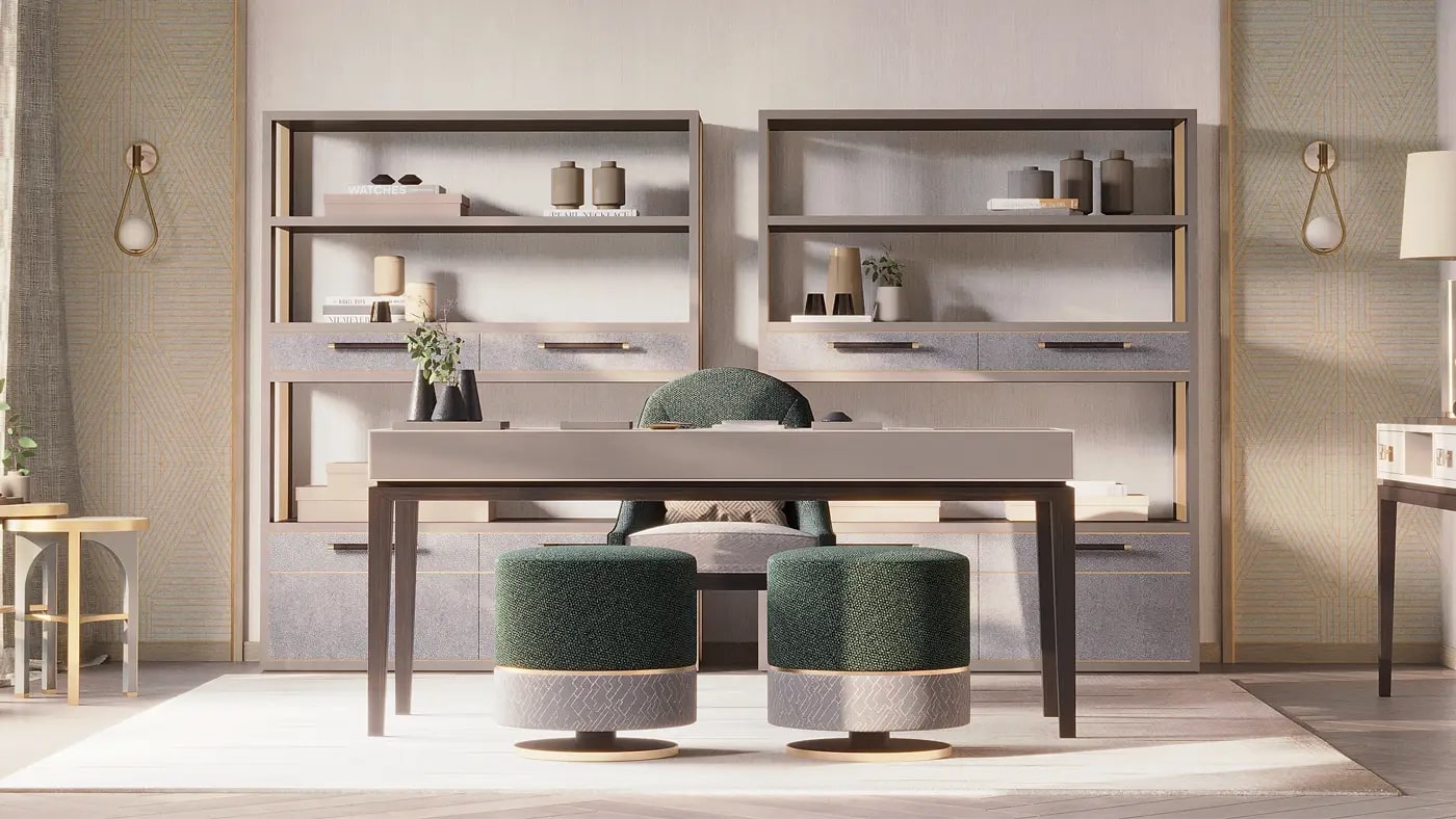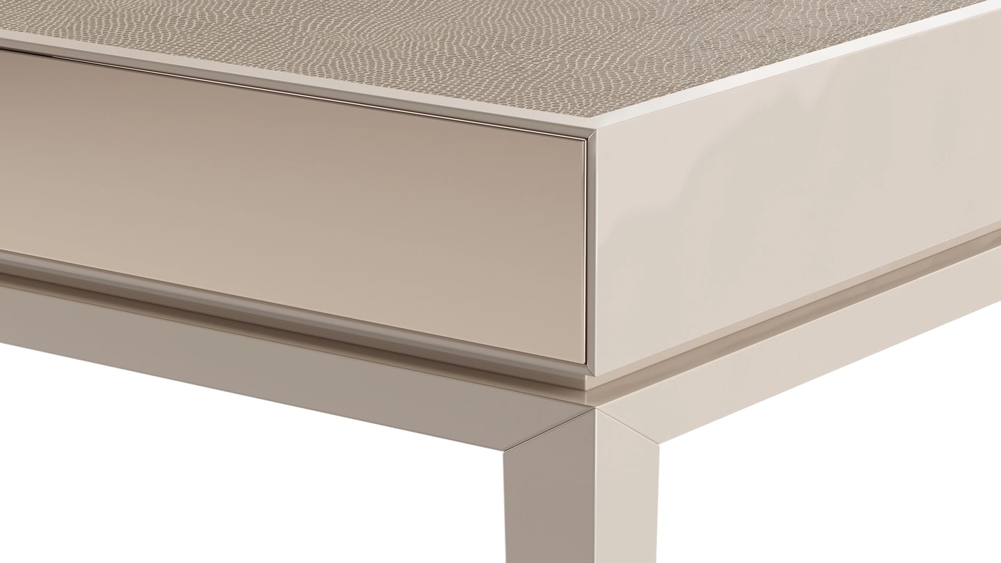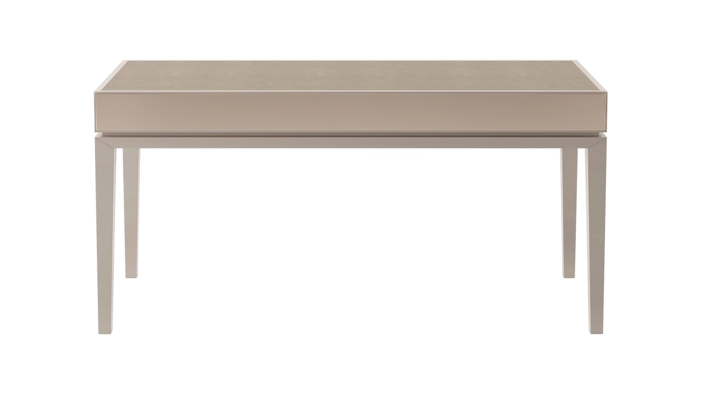 Каким бы обтекаемым он ни был, монотонный письменный стол BUZIOS по-прежнему оставляет место для некоторых дизайнерских излияний. К ним относятся текстурированная кожаная поверхность, бронзовая зеркальная инкрустация сзади и ручки, выполненные из черного перламутра.