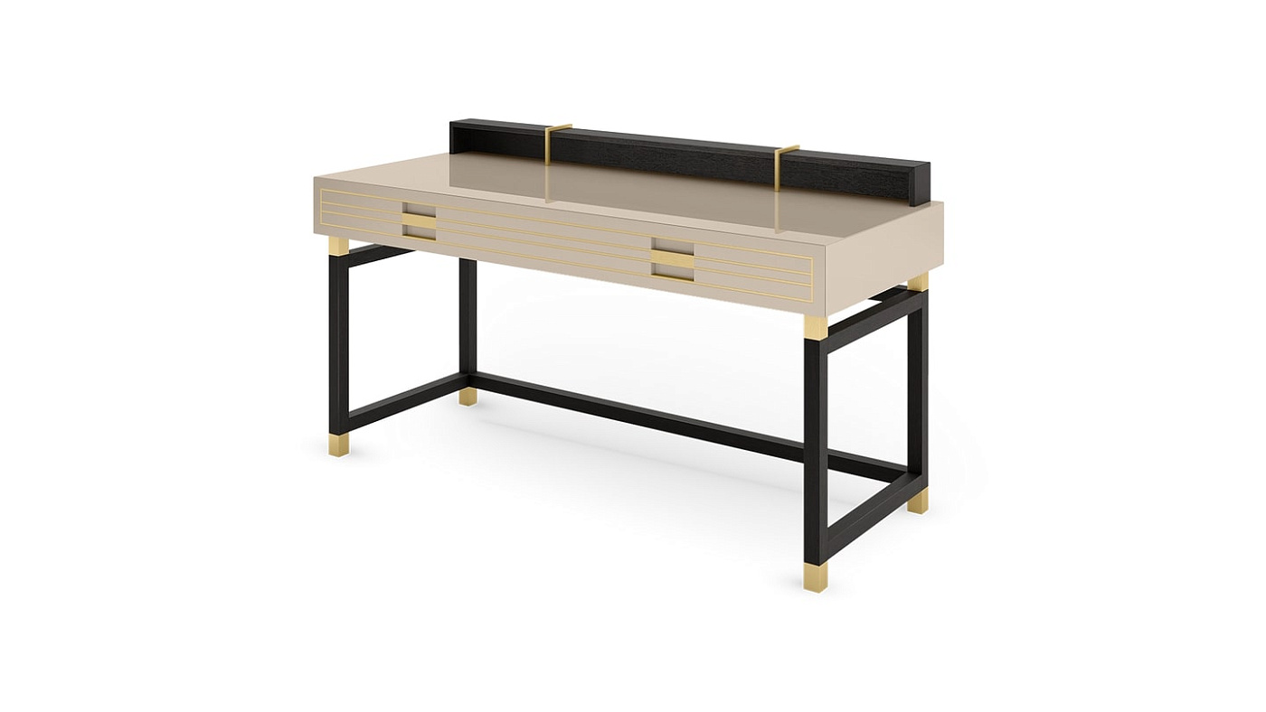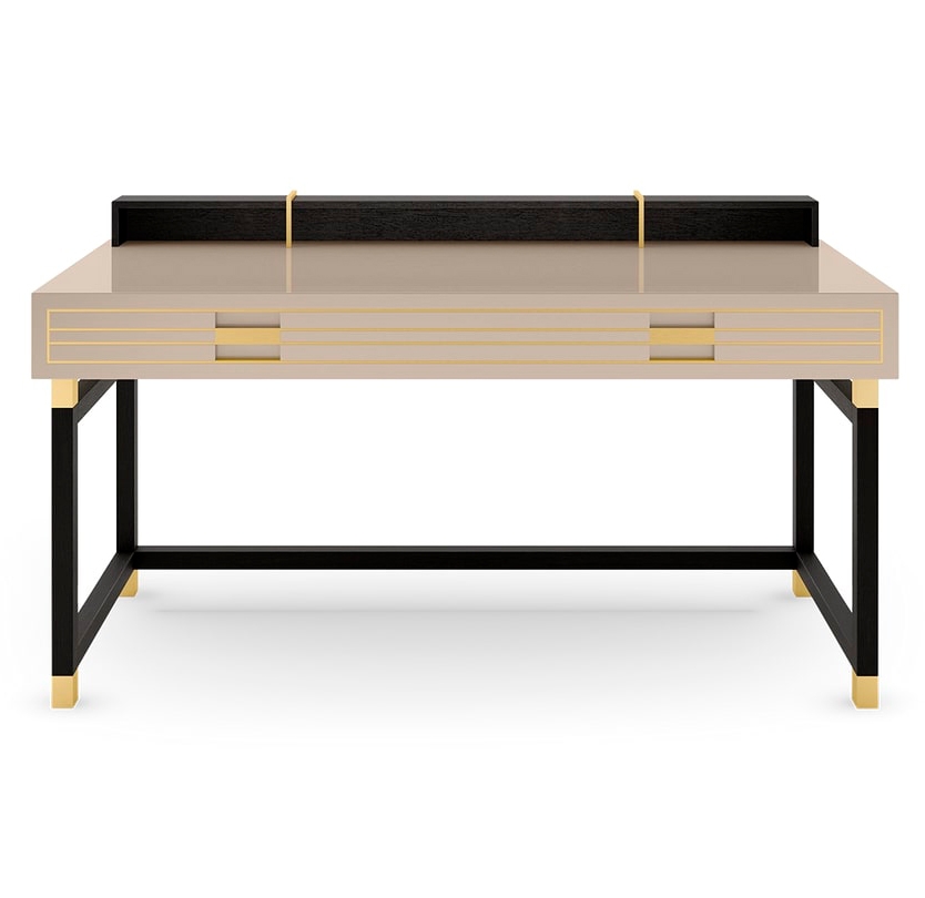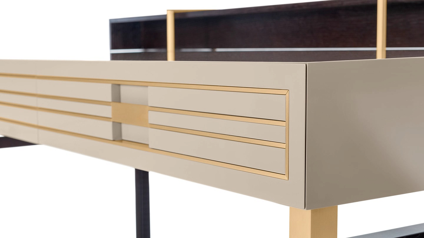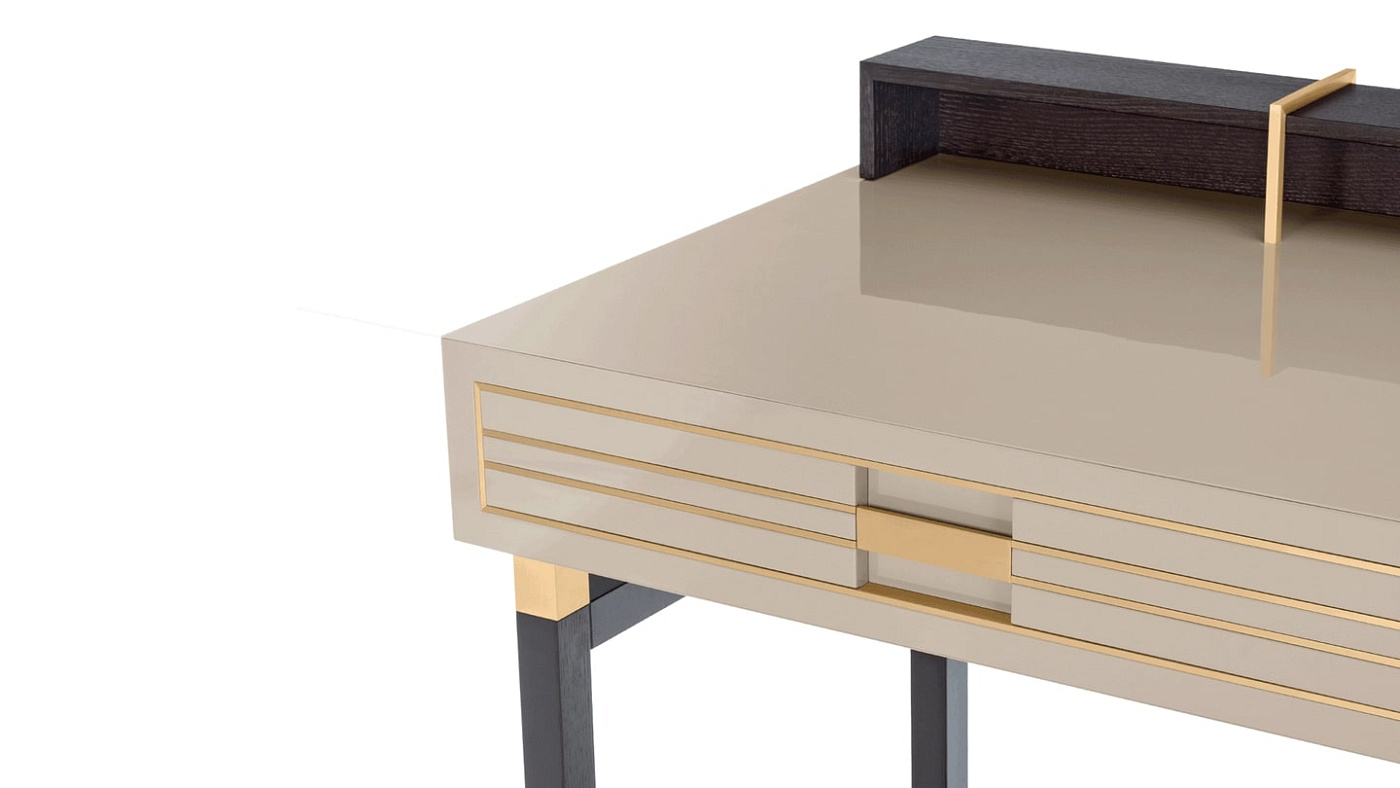 Стол EDINBURGH выполнен в стиле ар-деко и украшен вставками из матовой латуни, вставленными в глянцевое дерево. Вместительная столешница и множество полок оставляют достаточно места для повышения производительности.