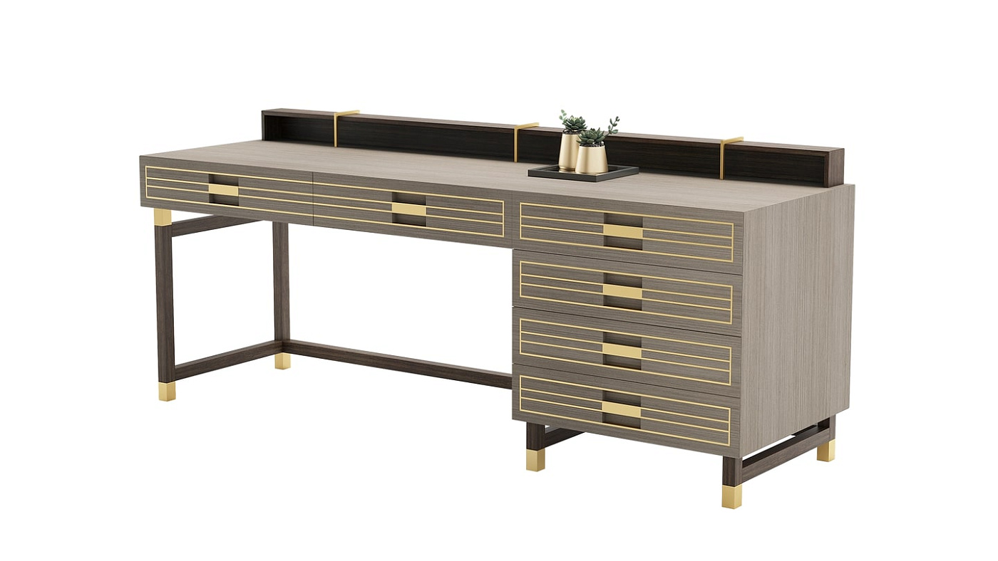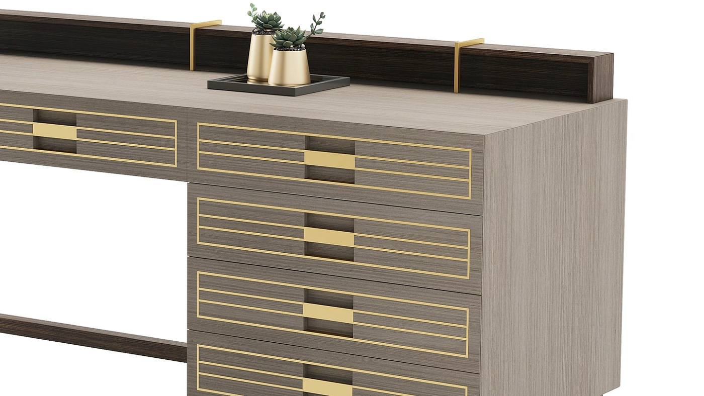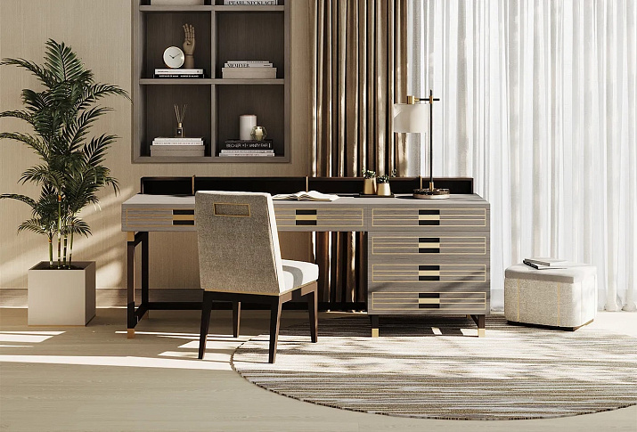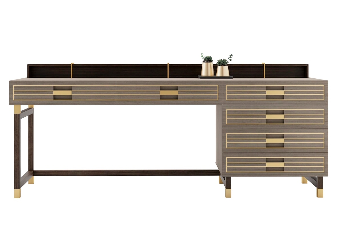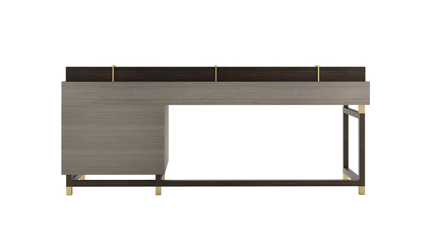 Красивый письменный стол EDINBURGH II с угловатым силуэтом понравится тем, кто отдает предпочтение рациональному рабочему пространству, способствующему концентрации внимания, и в то же время ценит металлические украшения, которые придают нотку изысканности его фирменному сочетанию шпона, лака и массива дерева.