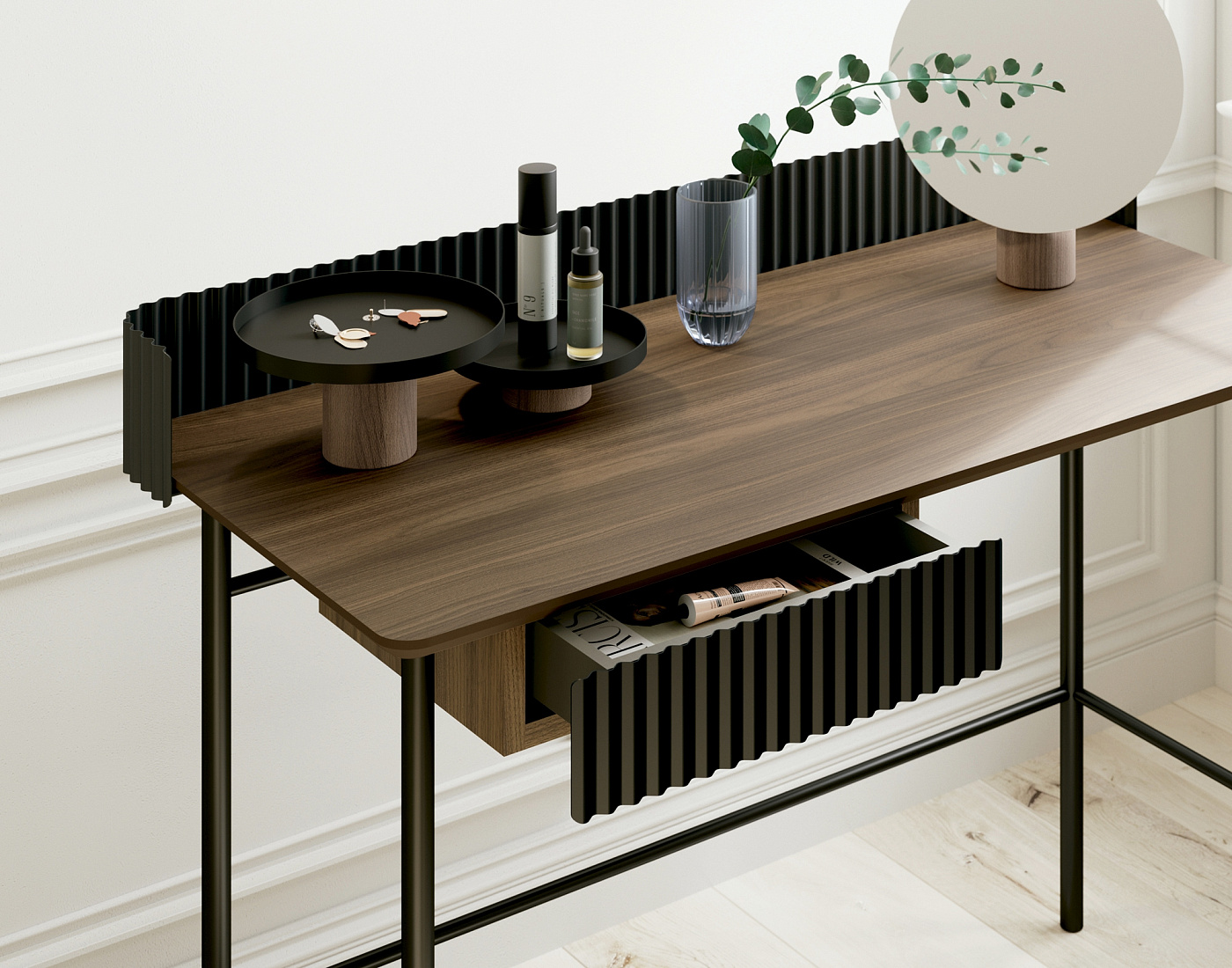 HIT — очень современная вещь, но она играет с традициями средиземноморской архитектуры, где мерцающий свет и тень, создаваемые его волнистыми фасадами, переносят нас в интимность и воспоминания в домах в часы яркого солнца. Это очень универсальный элемент, но с большой индивидуальностью. Игра сочетания дерева и окрашенного шпона делает его очень пластичным в вашей среде.
