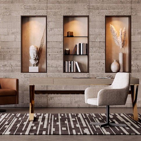 Ivy – деревянный письменный стол со скрещенными металлическими ножками, представленный из нержавеющей стали с лакированным верхом. Идеально подходит для эксклюзивного офисного декора, где принимают важные решения и проходят рабочие процессы. Это изделие идеально отражает ДНК бренда Laskasas.