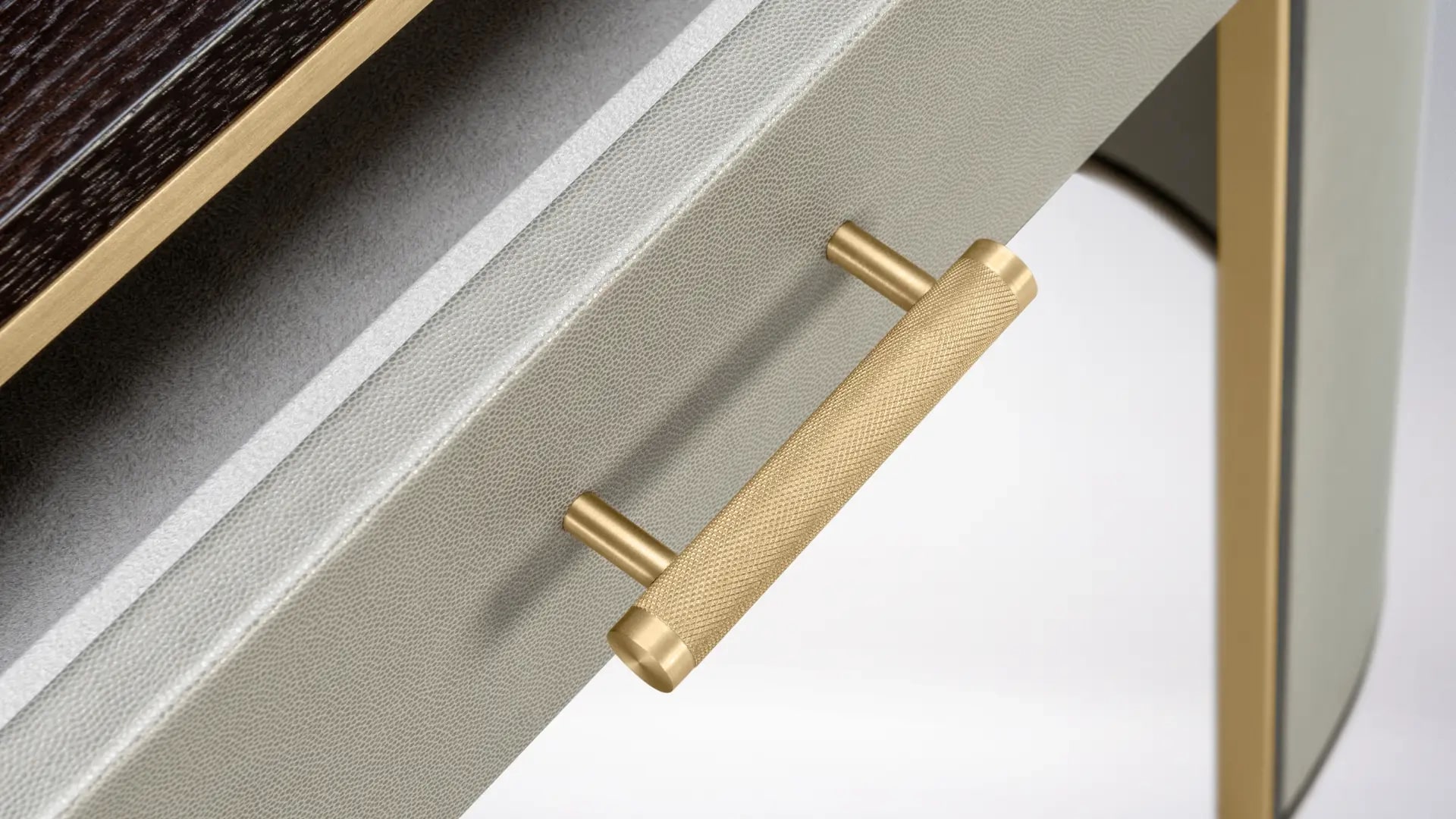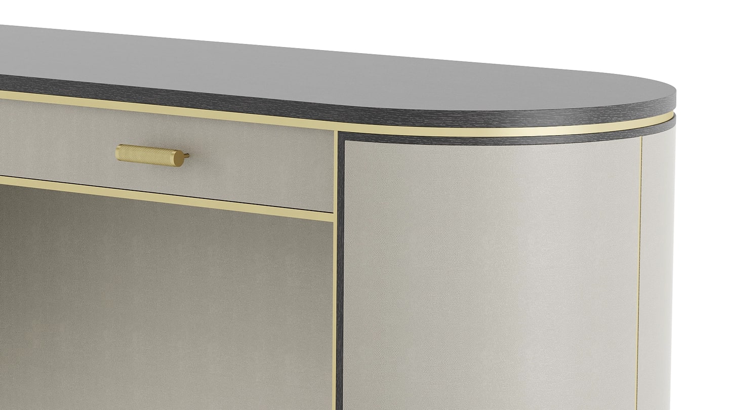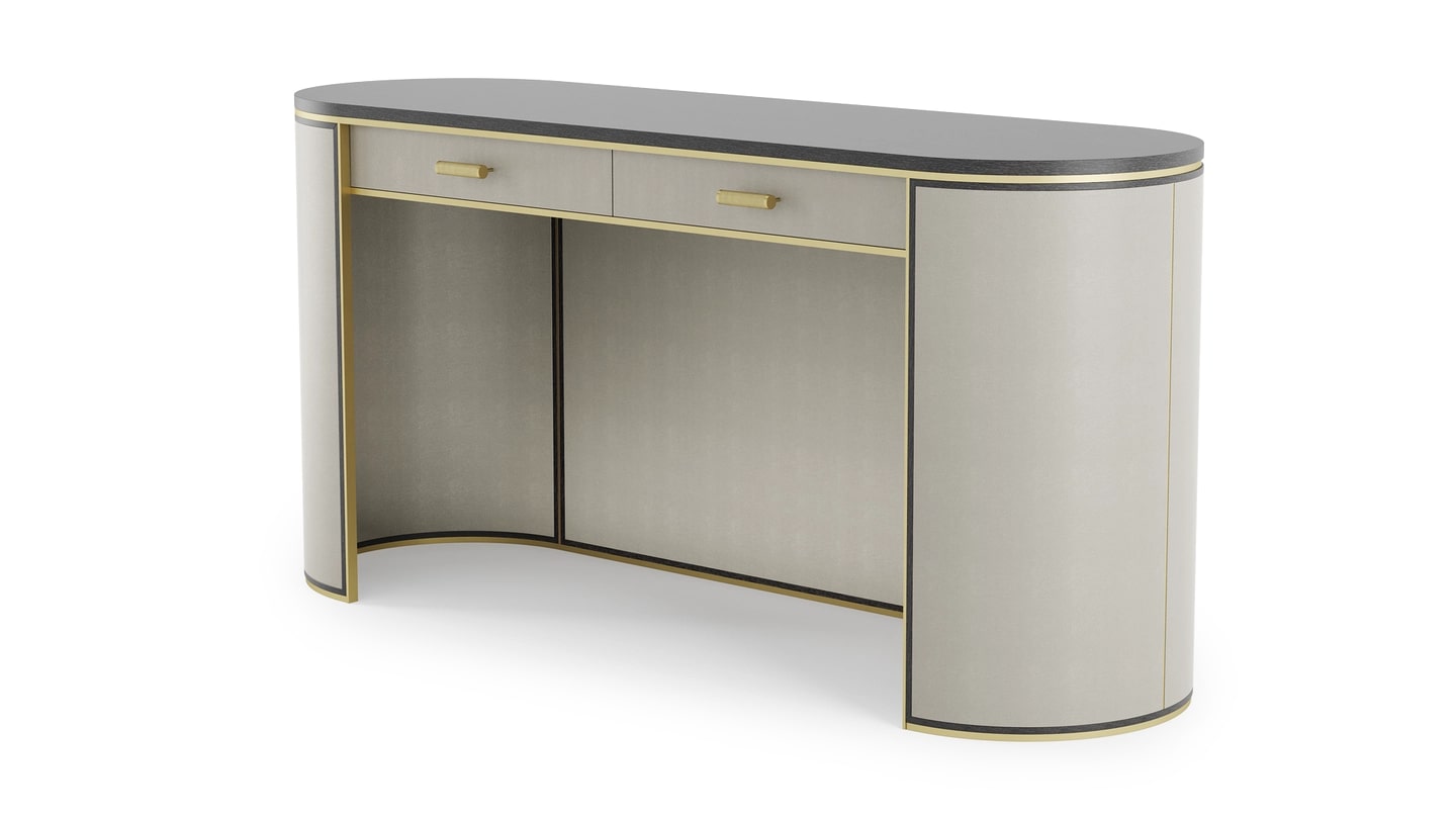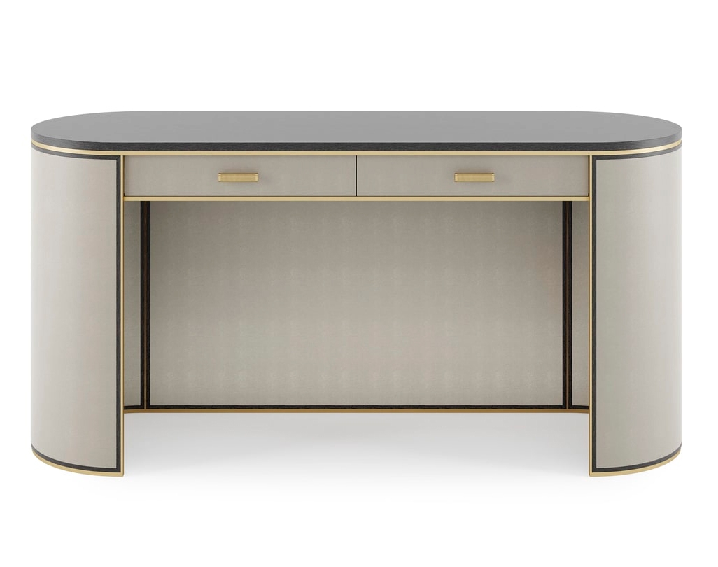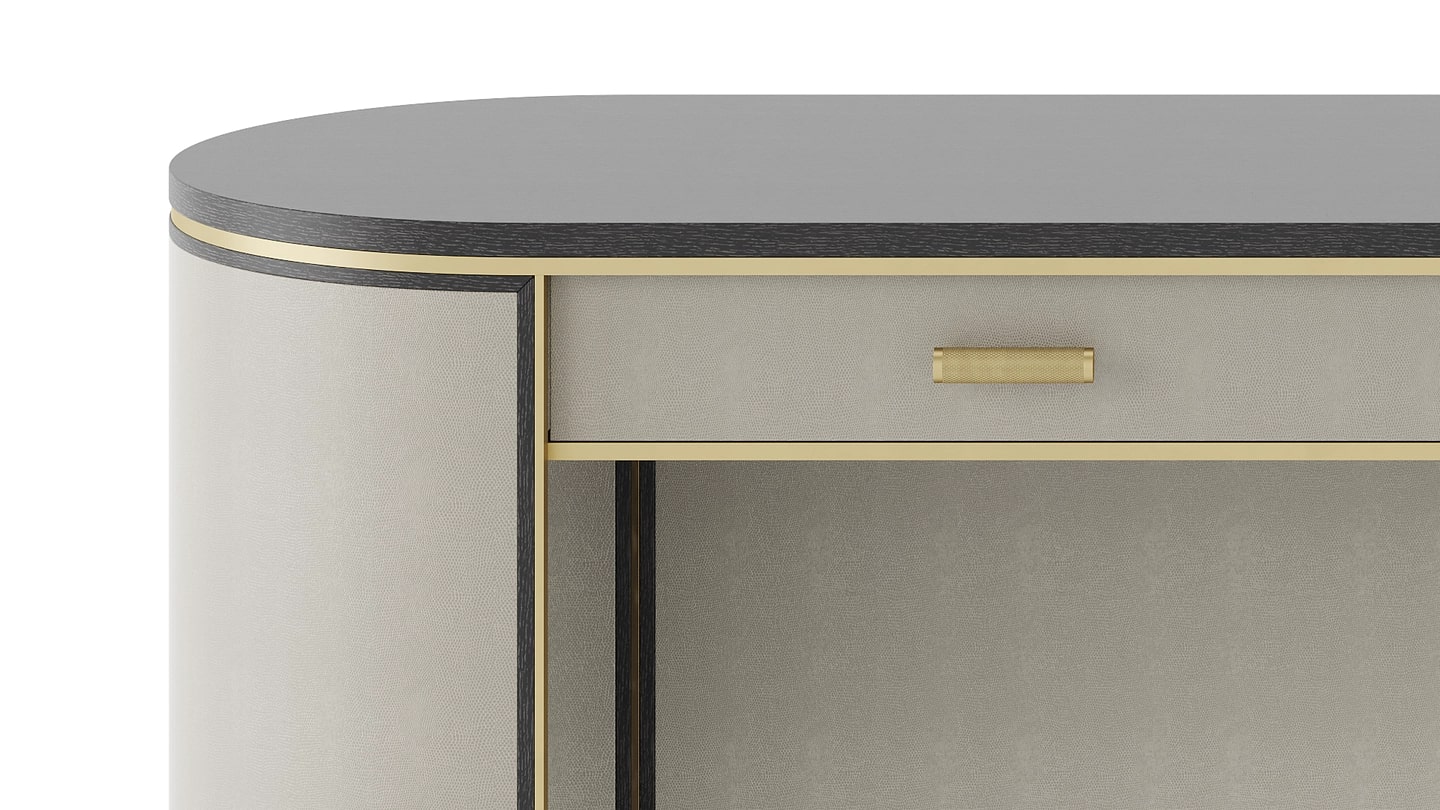 Компактное рабочее место с двумя выдвижными ящиками KENT desks neat profile поможет сосредоточиться на текущей задаче. Мягкая эллиптическая форма, искусно выполненная из шпона темного дерева, рифленой и матовой латуни и текстурированной кожи.