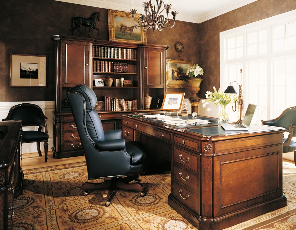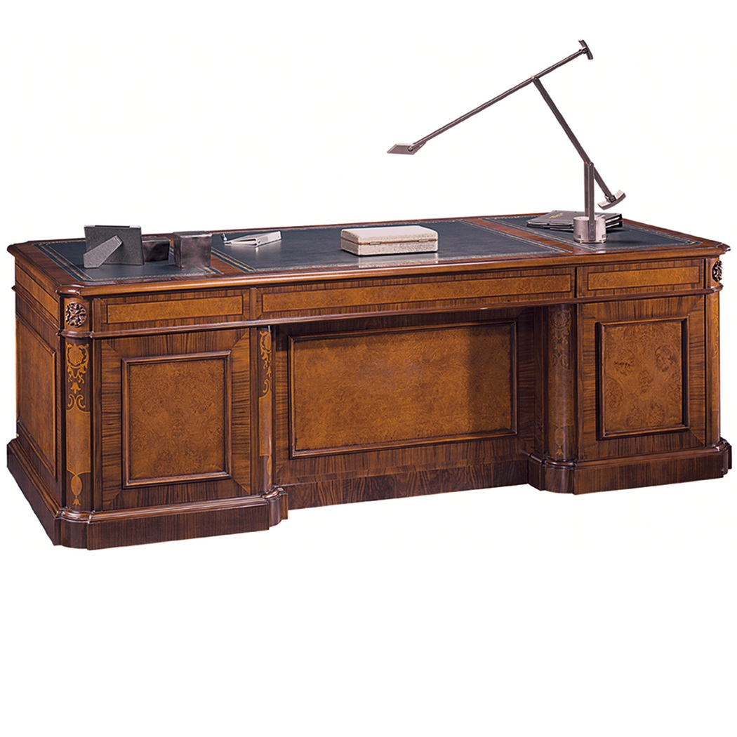Коллекция Zafiro отличается массивностью, а в дизайне Executive сочетаются изысканная инкрустация и плавные изгибы с инкрустацией из капа испанского дуба. Шпон из ореха и капа дуба, лады из фиолетового палисандра, латунная фурнитура 3 выдвижных ящика под столешницей. Левая тумба с 3 выдвижными ящиками. Правая тумба с 1 выдвижным ящиком и 1 ящиком для документов. Обе стороны запираются. Передняя часть с 2 потайными дверцами и регулируемой деревянной полкой внутри.