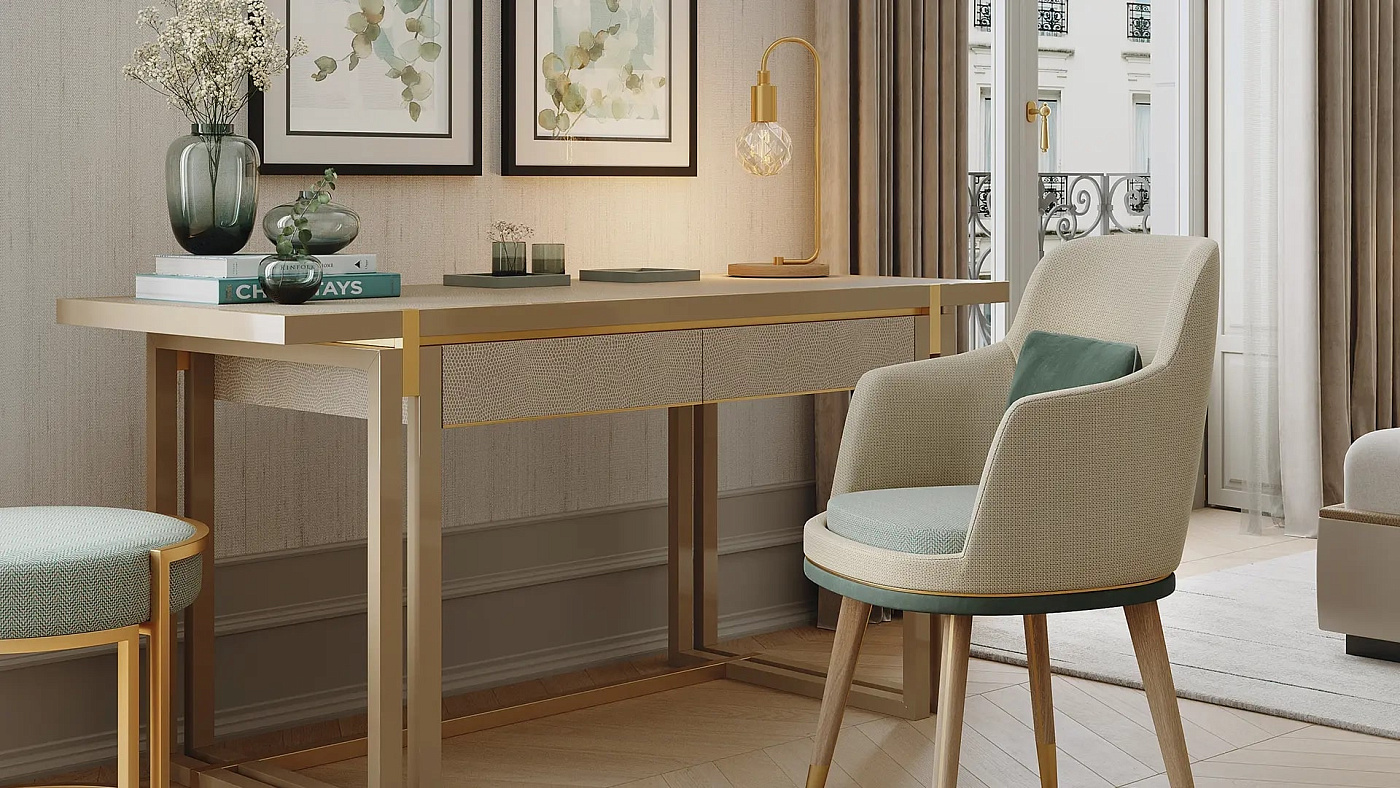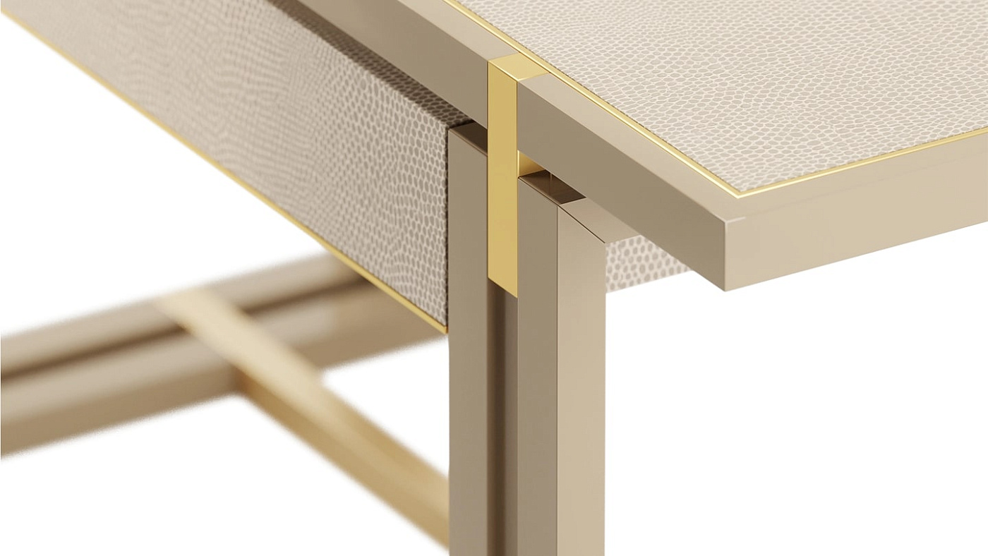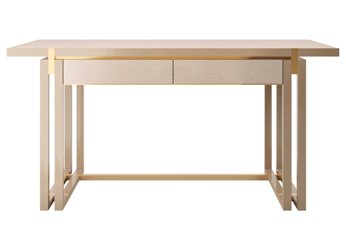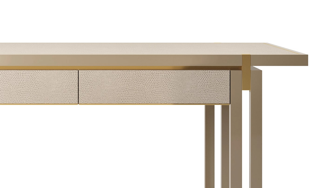 Универсальное бюро, два выдвижных ящика SEOUL desk без ручек дополняют его отделанный чистой тканью туалет, плавно открывающийся с приятным механическим щелчком, в то время как фасады и поверхность отделаны роскошной кожей, привлекающей вас к работе.