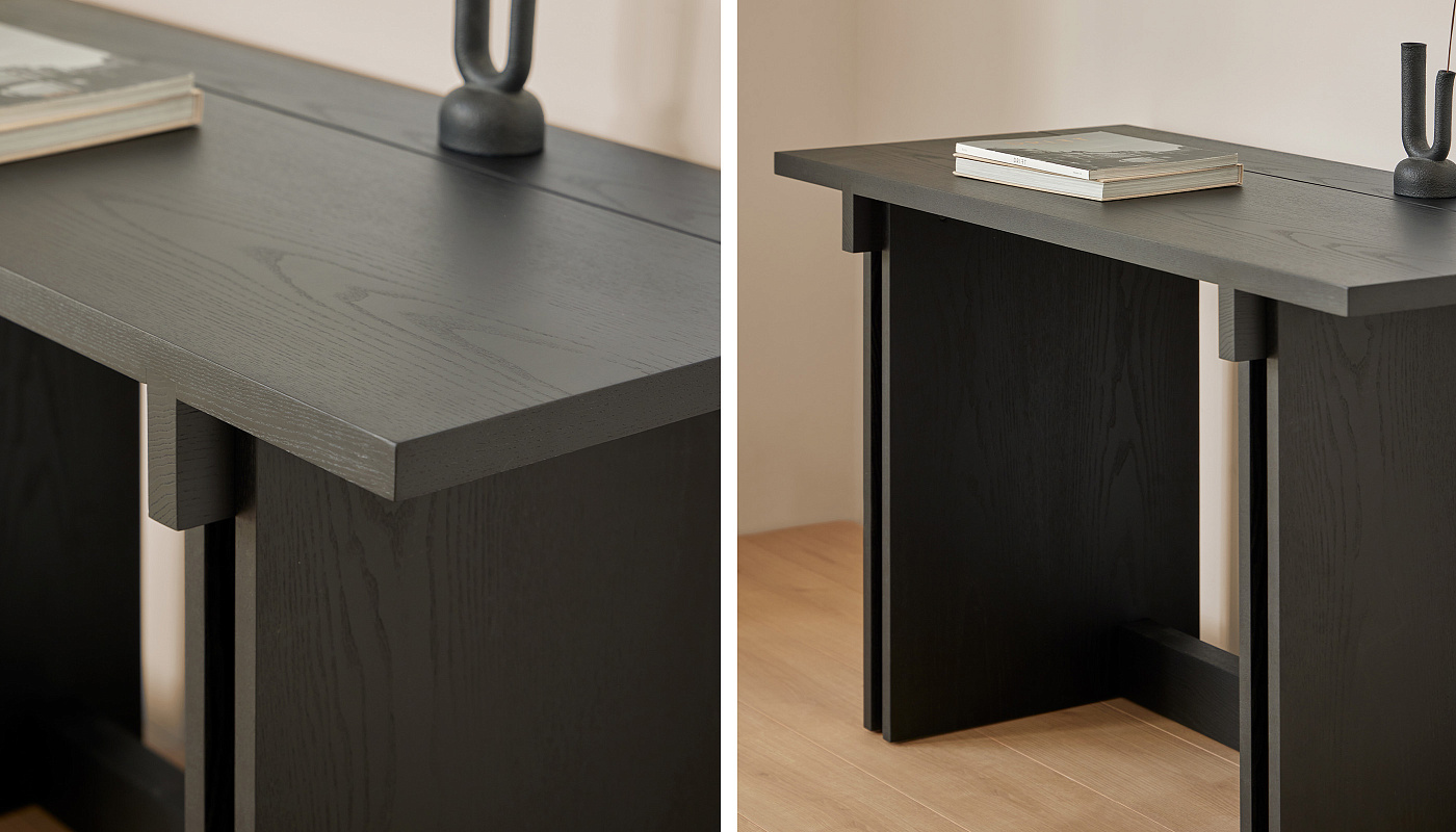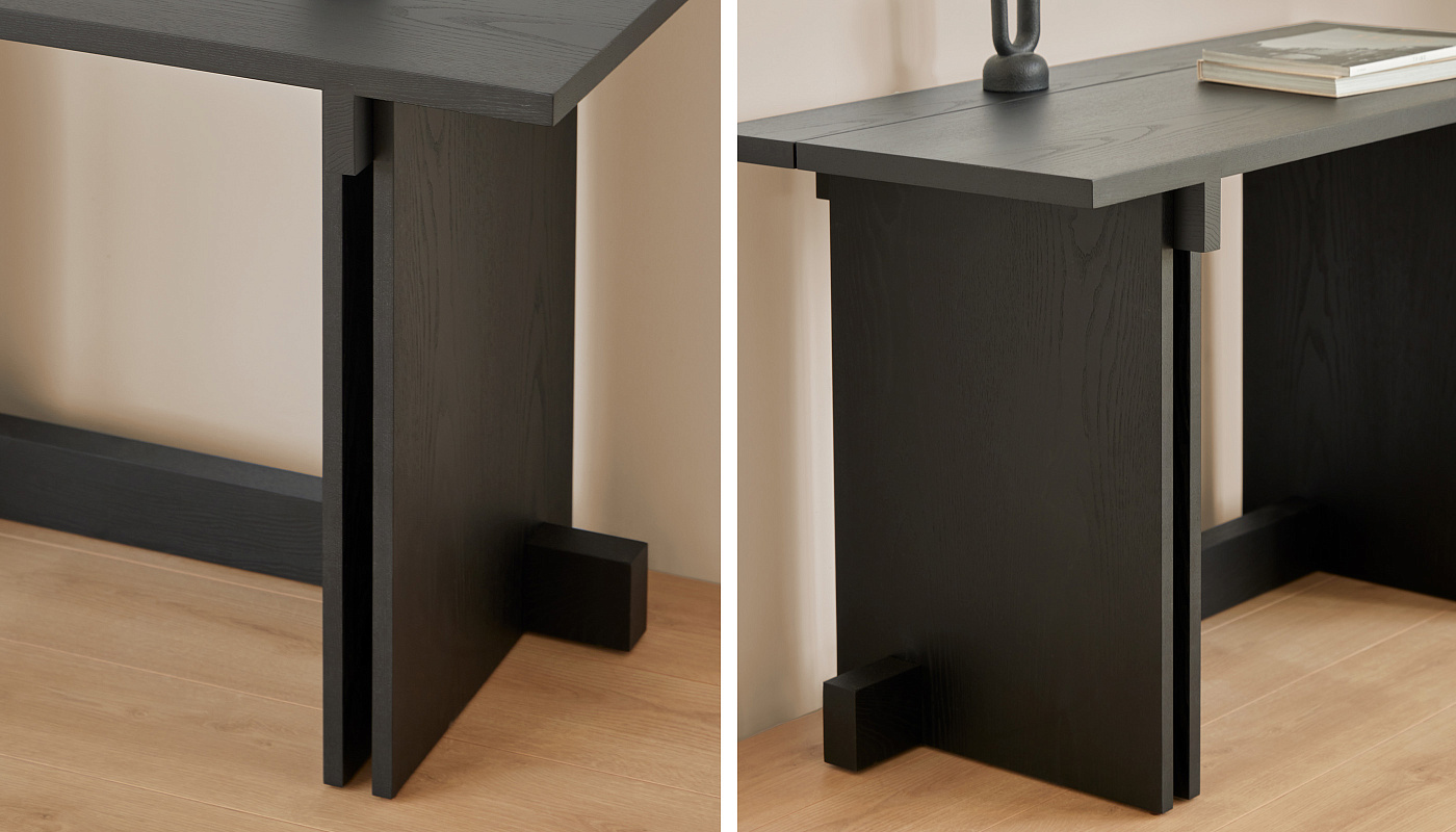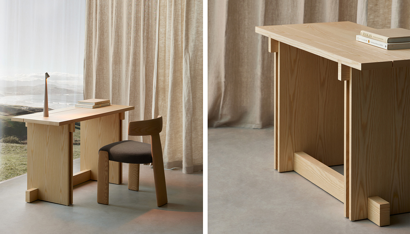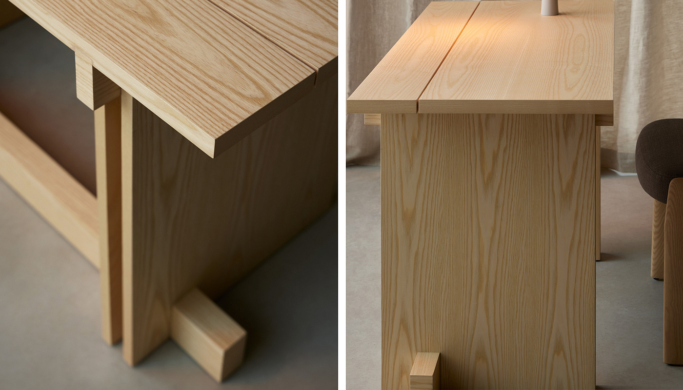 С отсылками как к прошлому, так и к настоящему, Rak можно интерпретировать как рационалистическое архитектурное повествование. Древесина ясеня, расположенная в перекрывающихся плоскостях, продолжает определять структуру, а четкие углы и строгая геометрия определяют ее индивидуальность. Каждый предмет коллекции рождается из одного и того же поиска: очистить композицию до самого необходимого. Rak не рассеивается, а естественно расширяется, сохраняя свою сущность в различных ситуациях. Это упражнение в непрерывности, где функциональность не противоречит глубине дизайна. Продуманность дизайна проявляется и в мелких деталях. Поперечины в месте соединения конструкции с крышкой и снизу обеспечивают прочность. Пространство между вертикальными сторонами создает интересную визуальную игру в месте пересечения с перекладиной. Стол образует уникальный и гармоничный ансамбль вместе со скамьями и табуретами из той же коллекции. Его элегантный дизайн в сочетании с качеством материалов создает уютную и изысканную атмосферу, идеально подходящую для любого пространства.