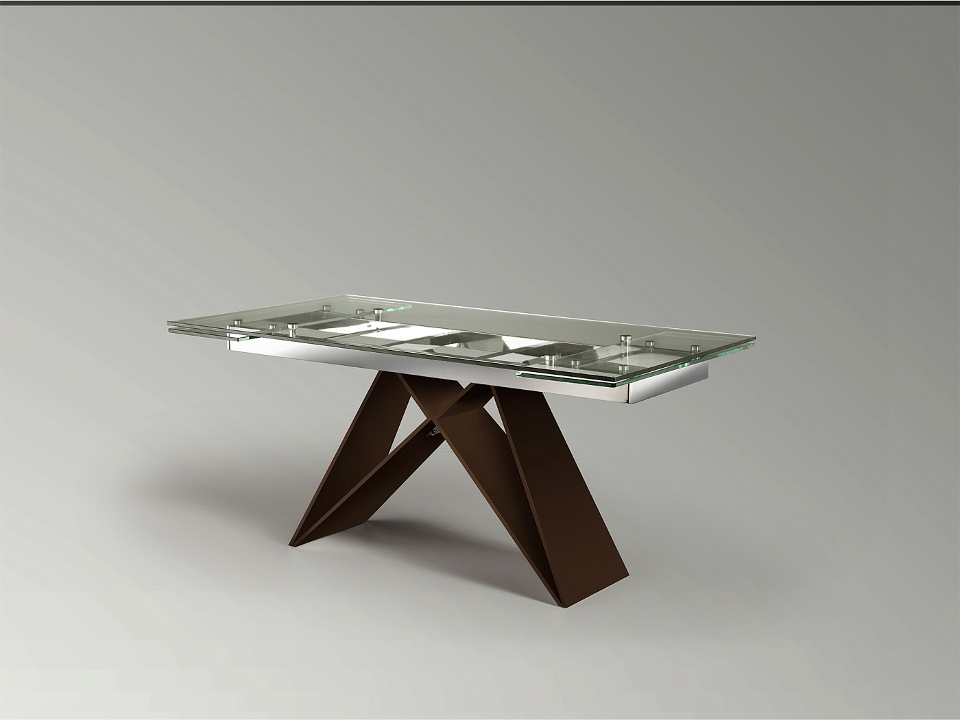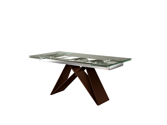 Обеденный стол раздвижной 160/220 см, изготовлен из нержавеющей стали, с глянцевой отделкой и основанием темно-коричневого оксида. Столешница из безопасного стекла толщиной 12 мм с полированным краем.