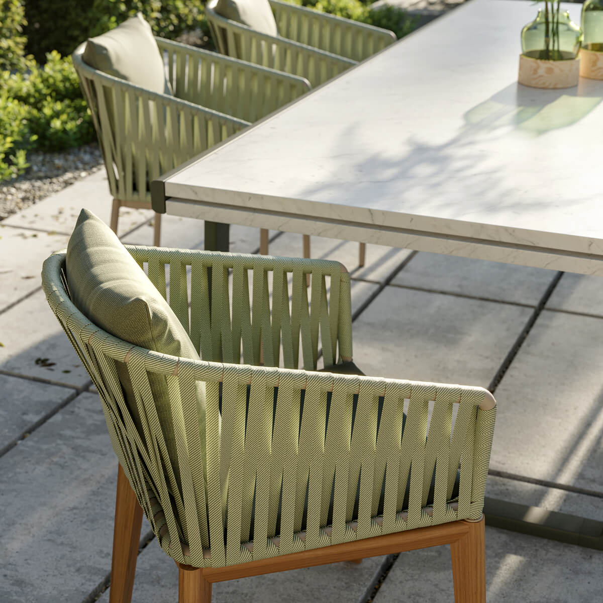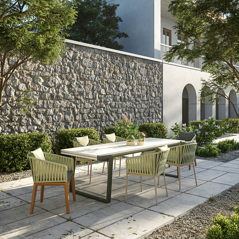 Для Kettal Bitta характерно сочетание алюминиевых рам, сидений из плетеного полиэстера и удобных подушек, столешниц из тика и камня.Моей целью было создать плотную оплетку, которая все еще пропускала бы воздух, напоминающую оплетку канатов, используемых для швартовки лодок (отсюда и название Bitta, что в переводе с итальянского означает "швартовка"), благодаря чему изделия выглядят легкими, но в то же время похожими на уютные гнездышки в естественных тонах можно посидеть и расслабиться.