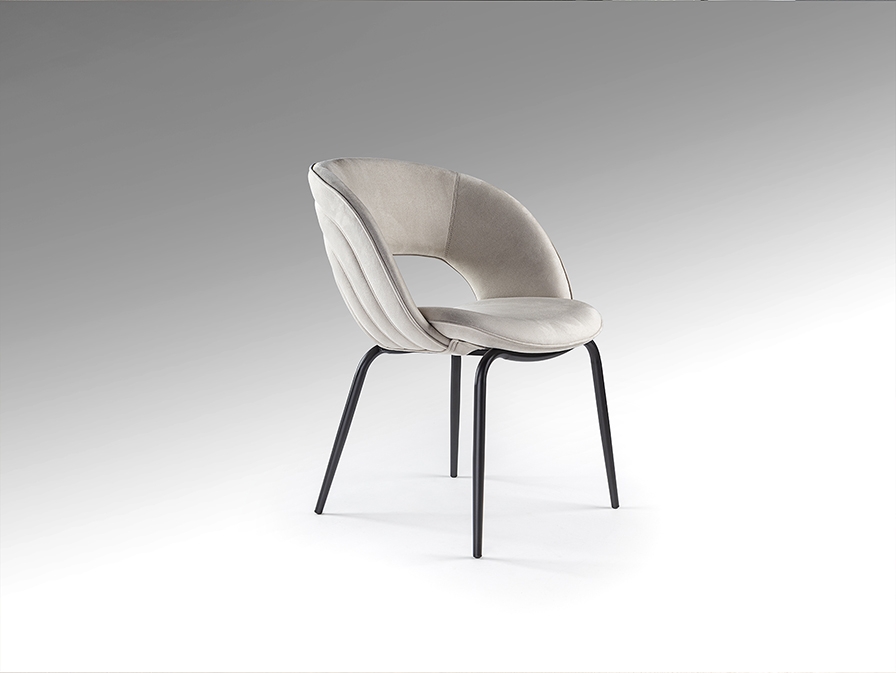 Стул из металла и изогнутой фанеры. Металлические ножки с черной отделкой и обивкой под замшу в цвете камня.
