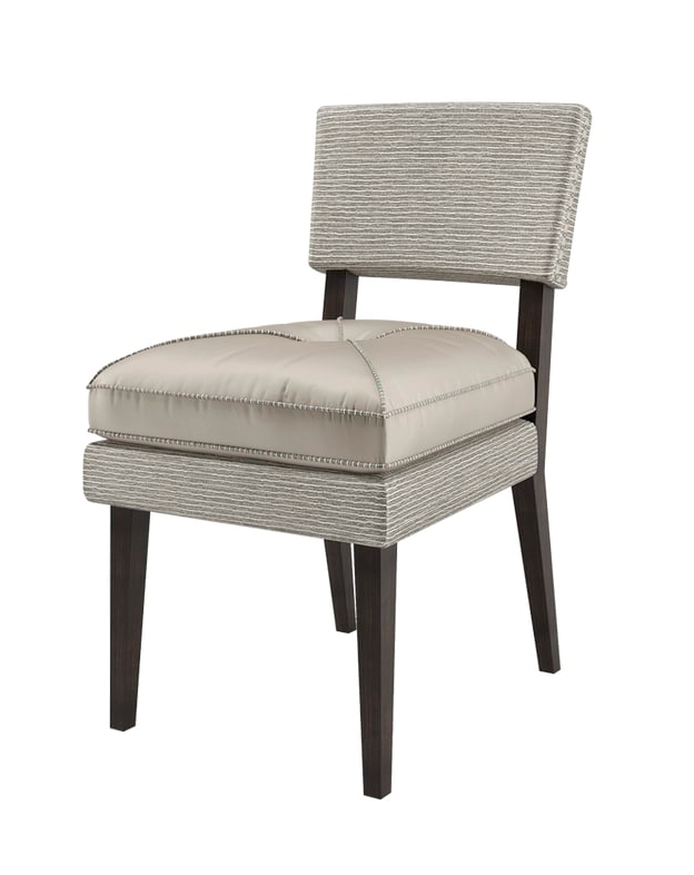 Наш стильный обеденный стул BASEL отличается классическим силуэтом, который подчеркивается оригинальной обивкой, в которой сочетаются однотонный бархат и ткань в полоску. Дополнительные дизайнерские изыски включают в себя массивную конструкцию из темного дерева и металлические заклепки, которые обрамляют спинку.
