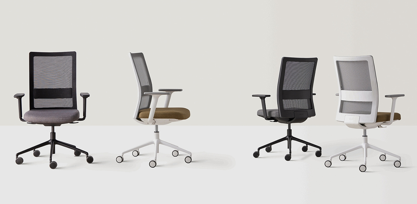 Вращающееся рабочее кресло со спинкой из технической сетки, регулируемой опорой для поясницы и газлифтом. Высота сиденья регулируется.