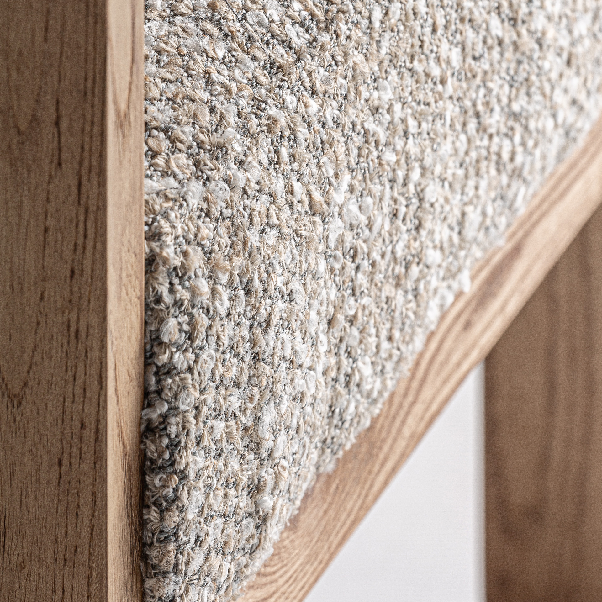 Стул изготовлен из бежевого полиэстера в сочетании со светло-коричневой древесиной дуба.