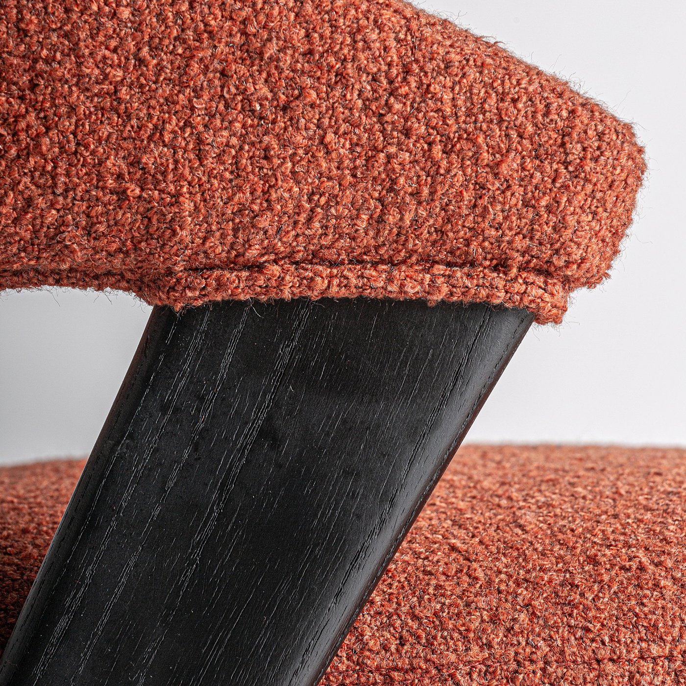 Стул изготовлен из красного полиэстера в сочетании с черным дубом и каучуковым деревом.