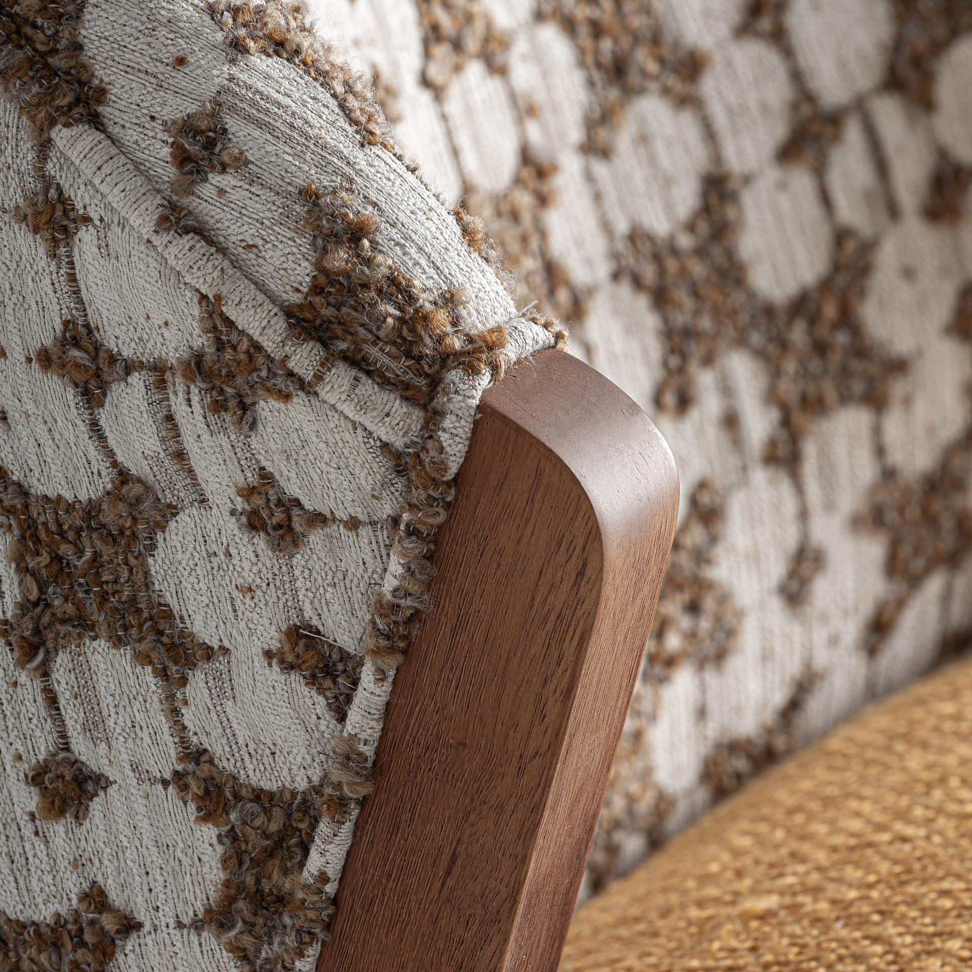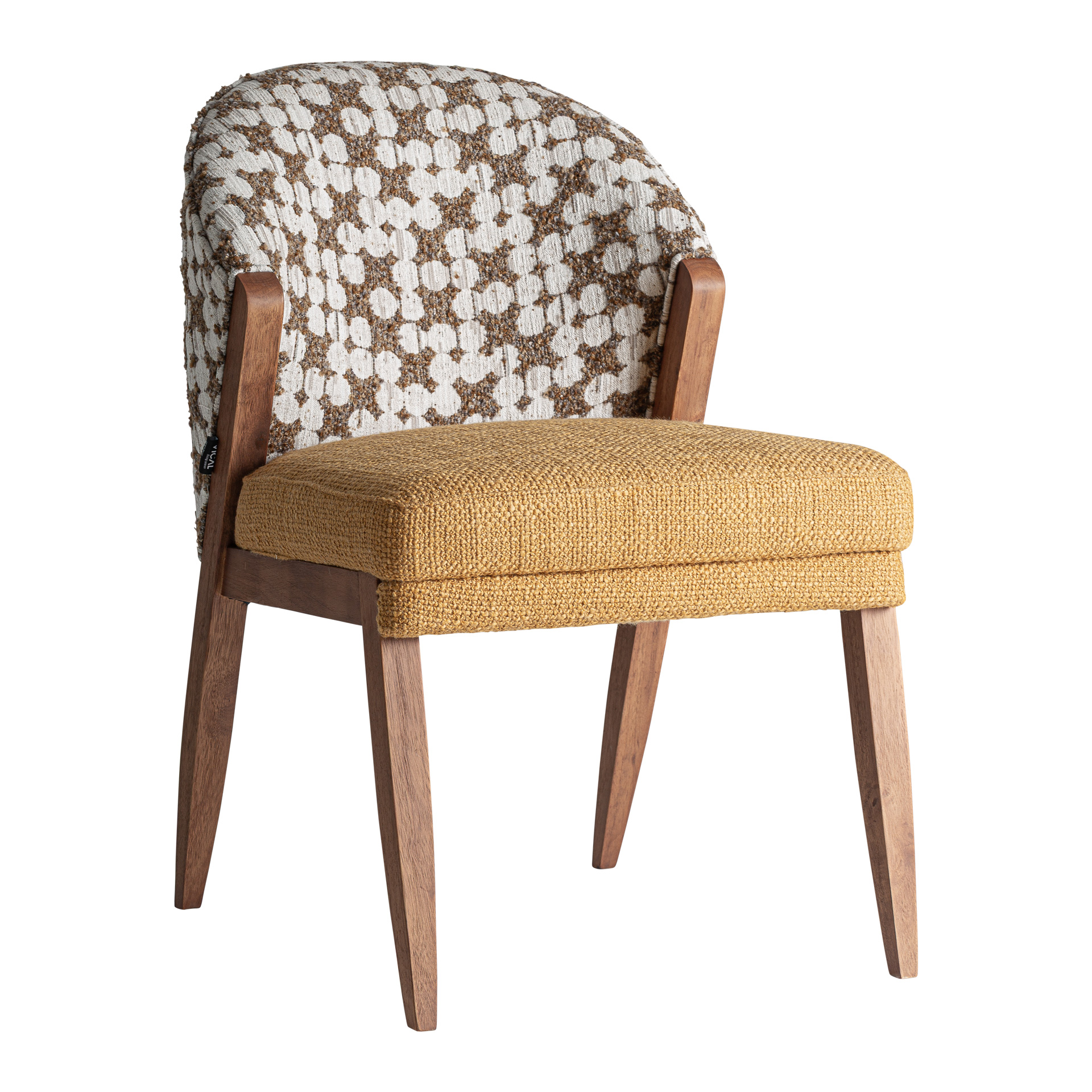 Стул, изготовленный из каучукового дерева коричневого цвета, в сочетании с хлопком коричневых и горчичных оттенков. Ширина: 56 см, Глубина: 68 см, Высота: 85 см