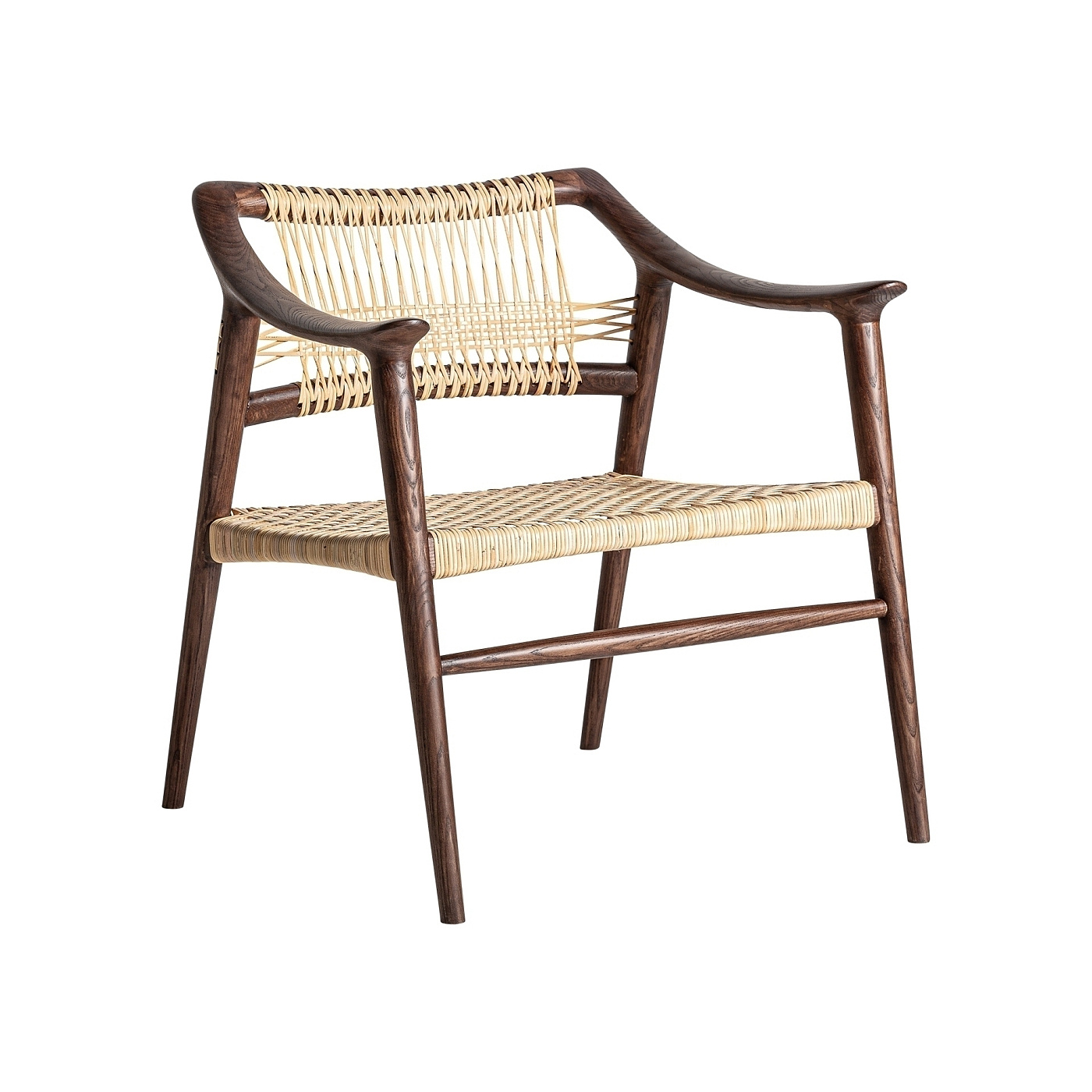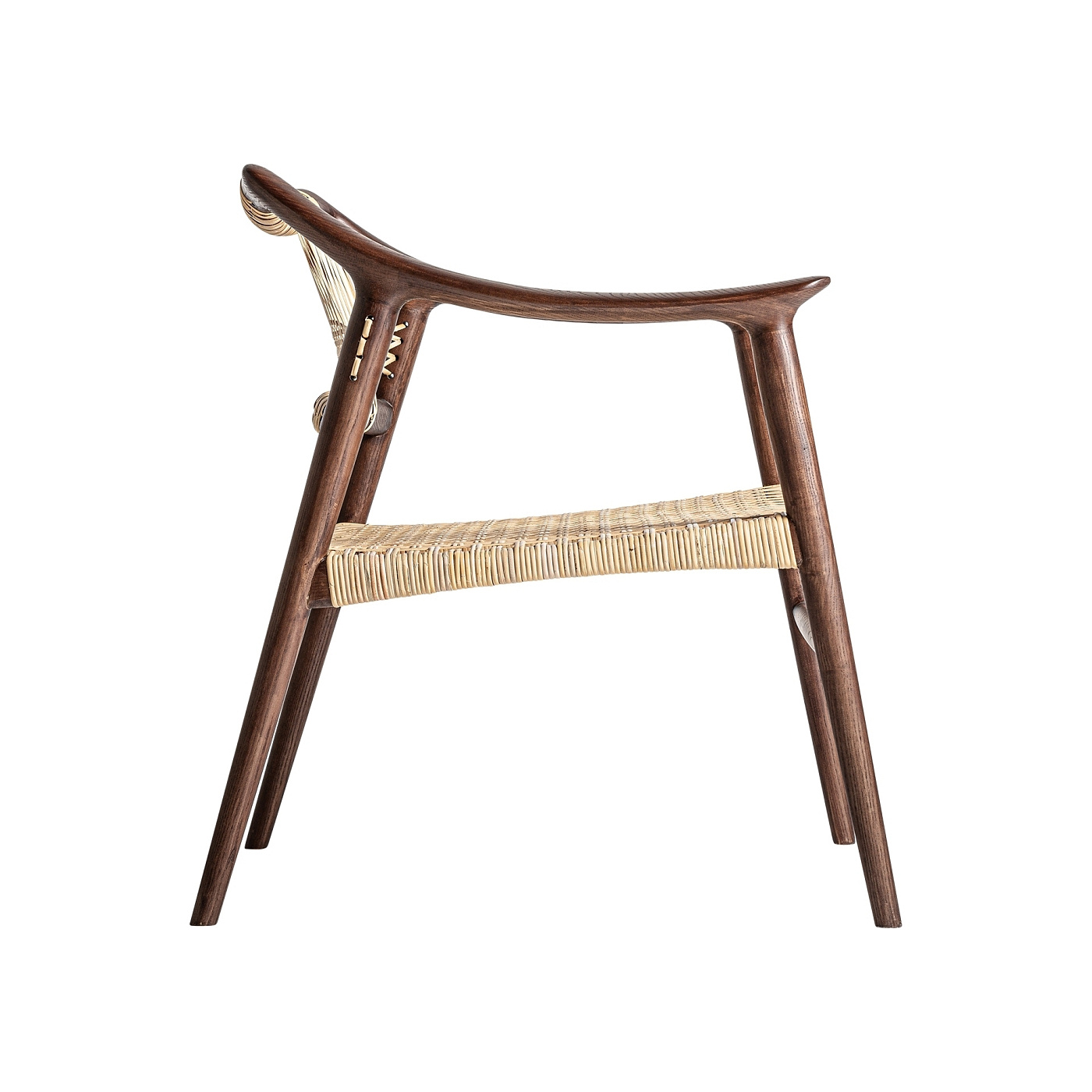 Стул, коричневый цвет, стиль бохо. Изготовлен из древесины ясеня в сочетании с ротангом.