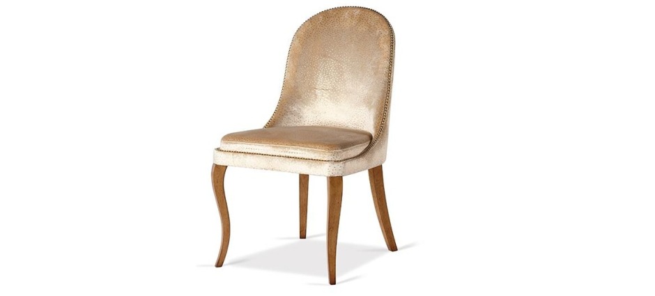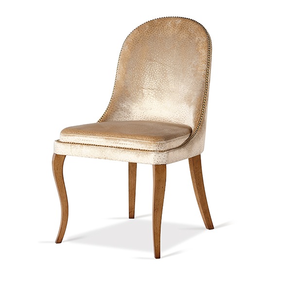 По своей форме модель стремится к креслу: мягкий, будто приобнимающий, этот стул станет вашим любимчиком. Каркас выполнен из дорогой древесины, под стать ему и фактурная обивка, украшенная декоративными гвоздиками. Изогнутые ножки враз оживляют дизайнерское решение и настраивают ничего не принимать слишком близко к сердцу.