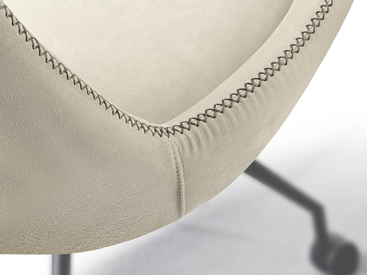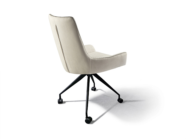Стул с колесиками, изготовлен из металла, матового черного цвета. Обивка из 100% полиэстера белого цвета с серой декоративной строчкой.