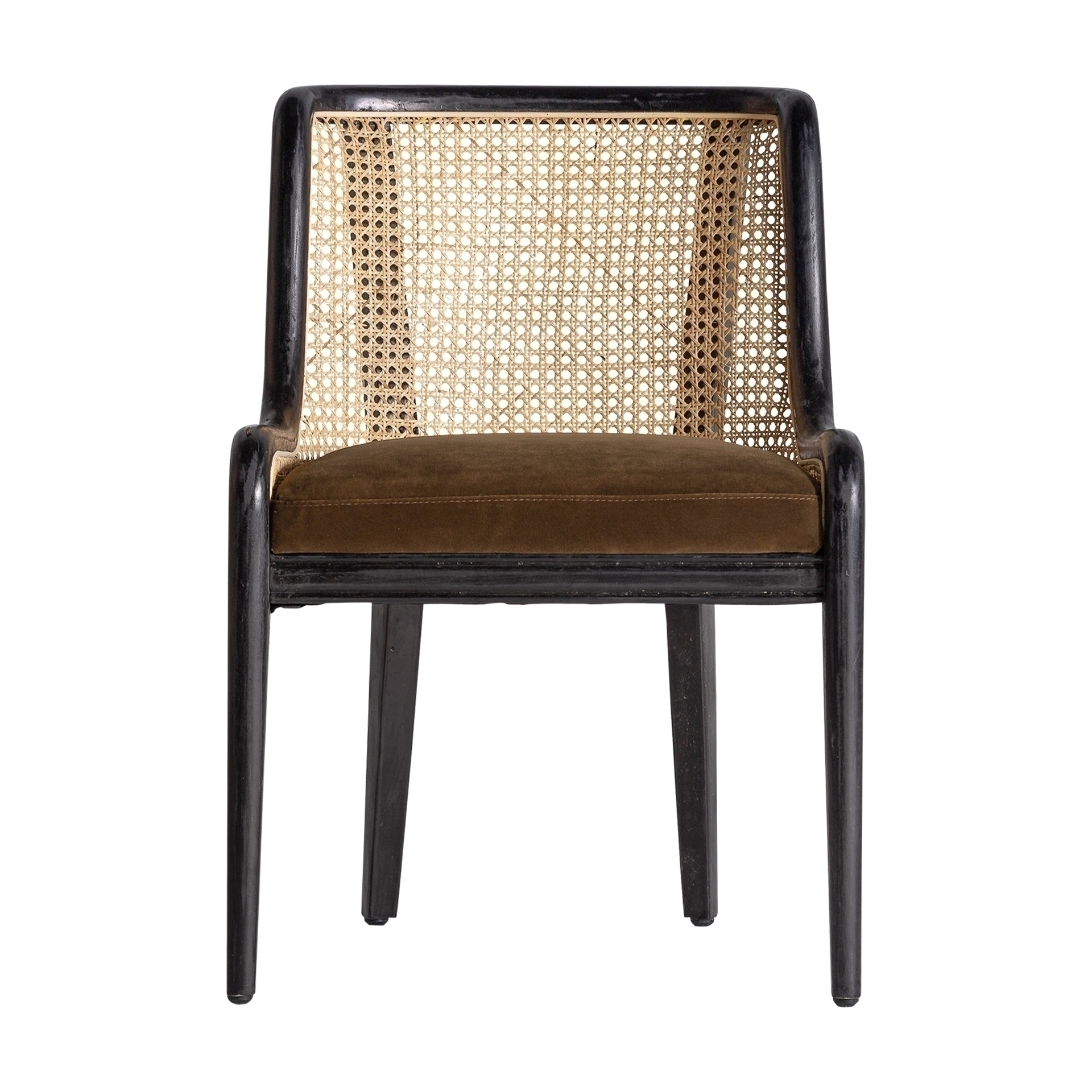 Стул Velburg, черный цвет, колониальный стиль. Изготовлен из ротанга в сочетании с каучуковым деревом и бархатом. Ширина: 54 см, Глубина: 58 см, Высота: 76 см.