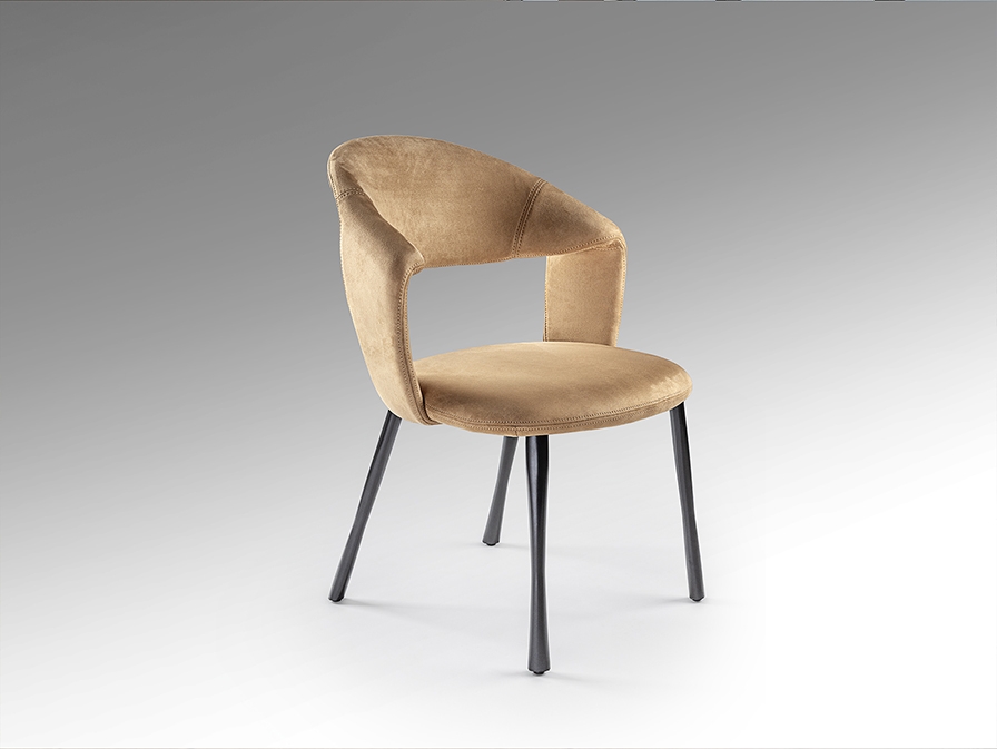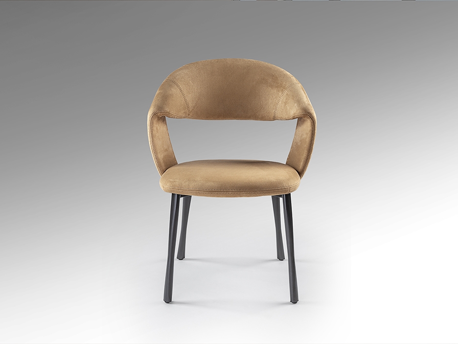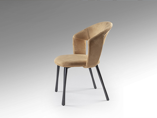 Стул из металла и изогнутой фанеры. Металлические ножки с черной отделкой и обивкой под замшу верблюжьего оттенка.