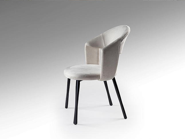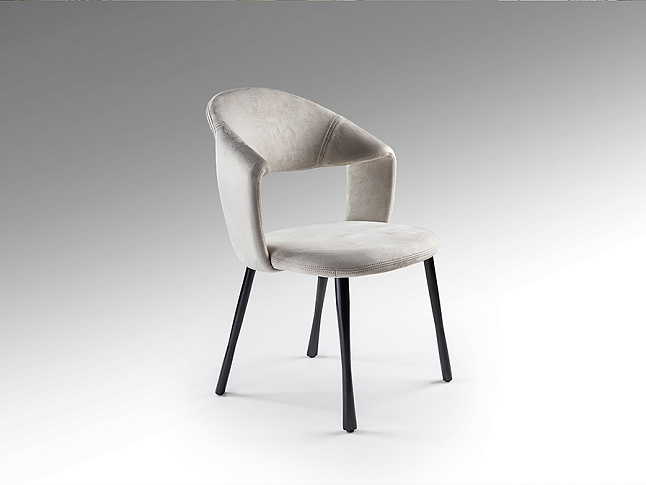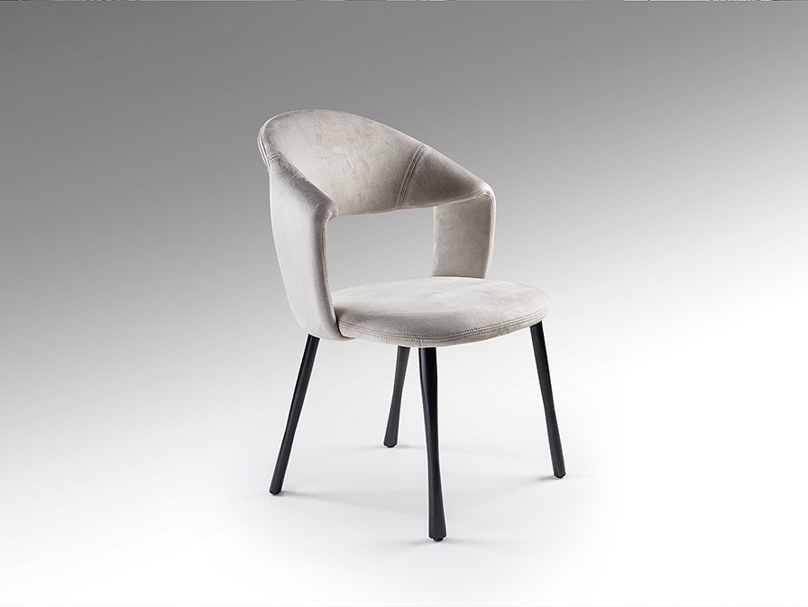 Стул из металла и изогнутой фанеры. Металлические ножки с черной отделкой и обивкой под замшу в цвете камня.