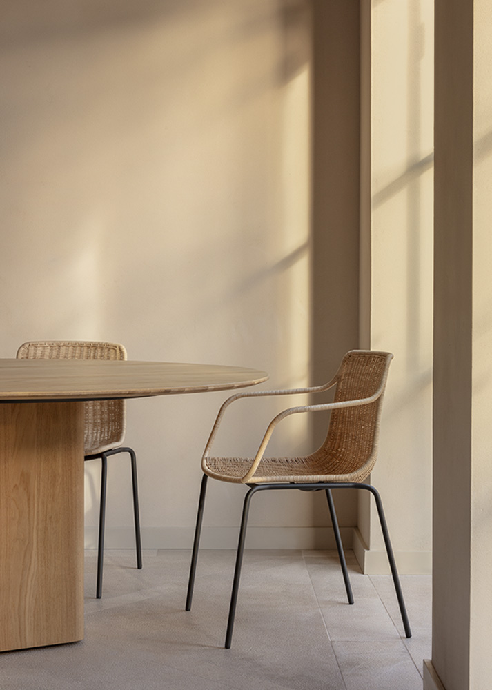 Обеденное кресло из нержавеющей стальной трубы. Сиденье и спинка из очищенного и тонированного натурального ротанга диаметром 2,5 мм/0,10″. Отделано трехступенчатым покрытием (краска, базовый слой и верхний слой), обладающим высокой устойчивостью к солнечному излучению благодаря УФ-фильтрам. Ножки из лакированной стальной трубы.