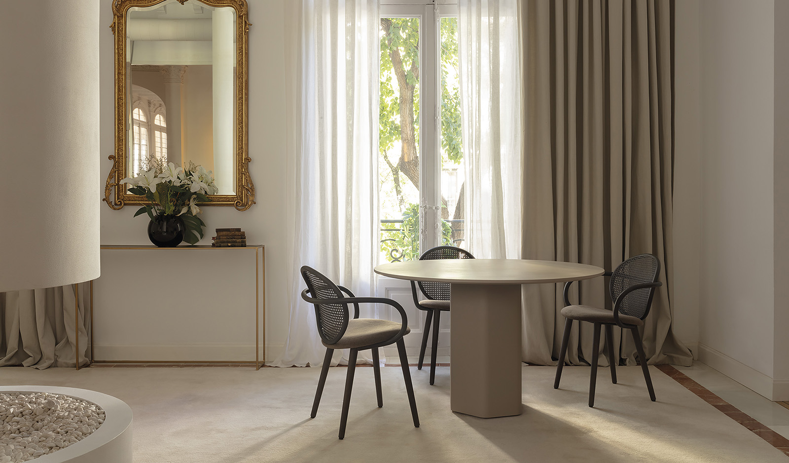 Обеденное кресло с каркасом из очищенного и тонированного натурального ротанга диаметром 28 мм/1,1 дюйма. Ножки из бука или лакированного бука (опция). Спинка изготовлена из тонированного натурального ивового прута («восьмиугольное плетение»). Отделано трехступенчатым покрытием на водной основе (краска, базовый слой и верхний слой), обладающим высокой устойчивостью к солнечному излучению благодаря УФ-фильтрам. Мягкое сиденье. Возможность персонализации с помощью широкого ассортимента высокоэффективных технических тканей. Защитные колпачки.