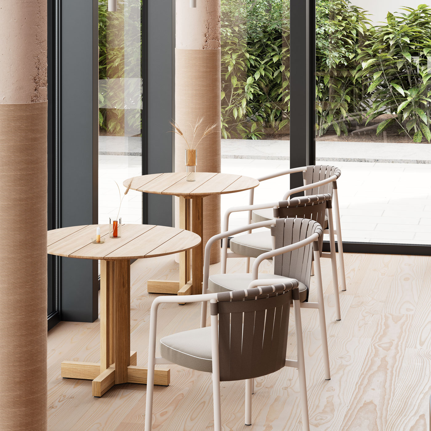 Коллекция Arc отличается обволакивающей спинкой, основанной на фундаментальной геометрии: дуге постоянного радиуса. Он демонстрирует сдержанные, элегантные пропорции. Легкая алюминиевая рама явно выражает желание сохранить традиции кресла. Спинка украшена простыми , но изысканными плетеными полосками, в то время как сиденье обито пенополиуретаном, обтянутым тканью в тон, а тканевая подушка имеет съемный чехол. Коллекция используется в основном в отелях, в вестибюлях и номерах, на круизных лайнерах, а также в домашней обстановке в качестве легкой мебели для диванов и обеденных зон.