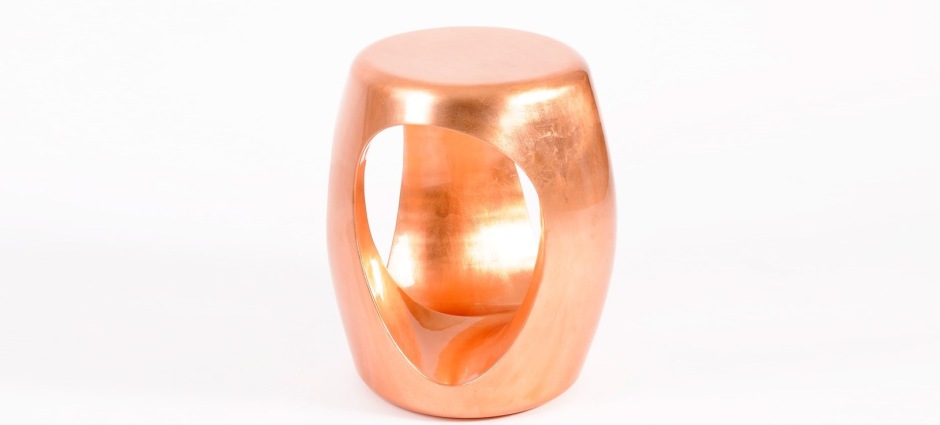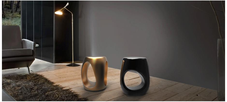 Табуретка Carved от португальского производителя элитной мебели компании Boca do Lobo отличается необычным дизайном. Она изготовлена из стекловолокна и может иметь несколько цветов и вариантов отделки. Перед покраской табуретка Carved покрывается тончайшими листами золота, серебра или меди. И только после этого ее красят в один из четырех цветов: изумруд, лазурит, аметист и цитрин. Аналогичная техника применяется для отделки настольной лампы Feel.