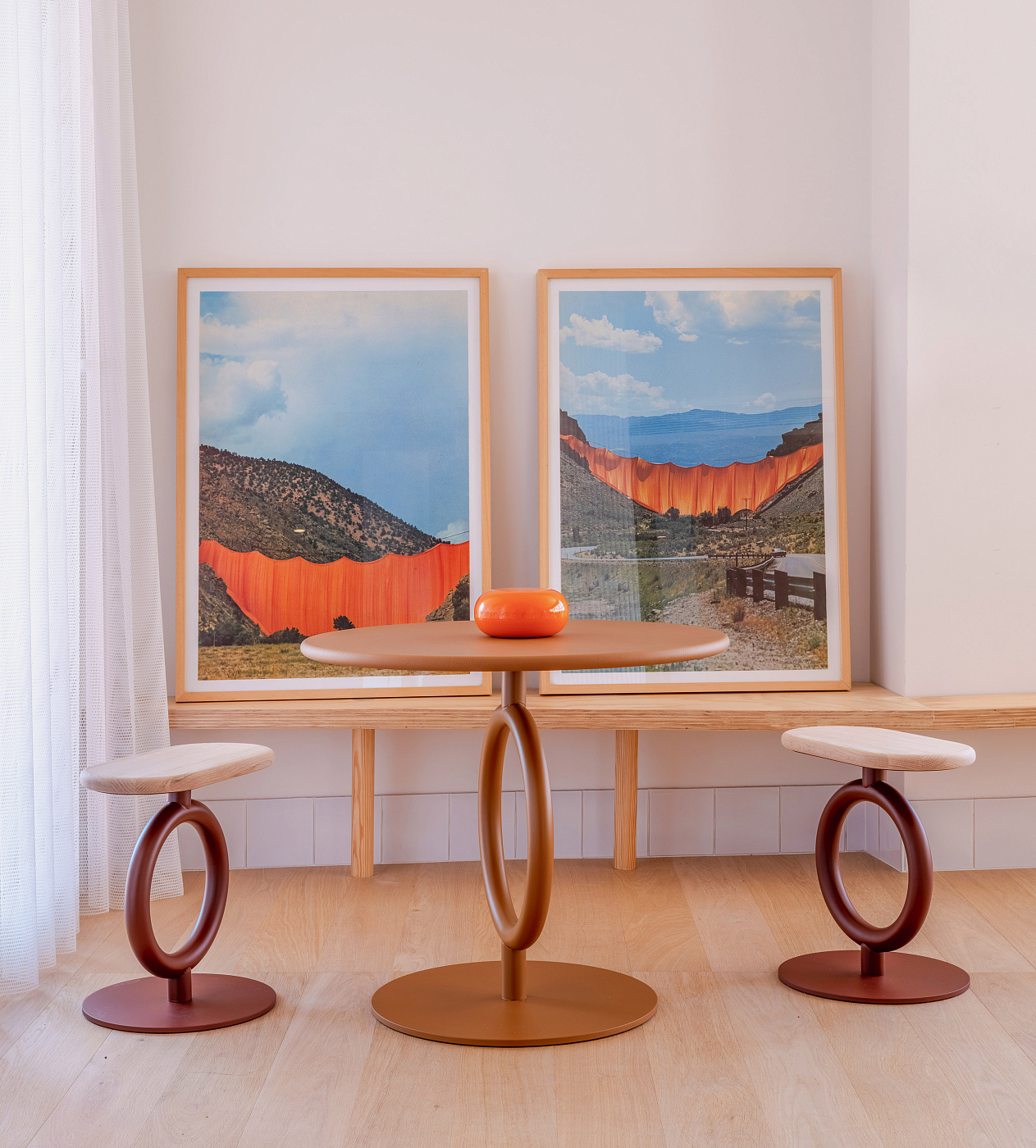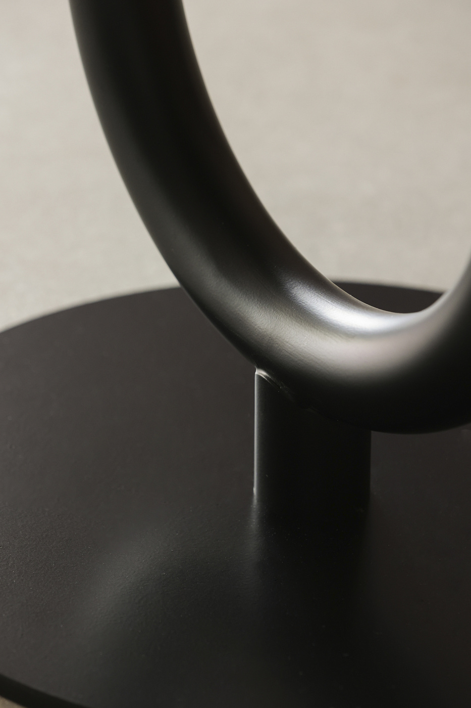 Тонкая, на вид изящная конструкция прочна и прочна, поскольку ее широкое основание стабилизирует хрупкое равновесие, возникающее в результате прямой, опирающейся на окружность. Центральное кольцо, помимо уравновешивания, подчеркивает весь характер и служит подставкой для ног. Несмотря на то, что сиденье уменьшено до самого необходимого, оно увеличивает комфорт и объем почти двухмерного изделия.
