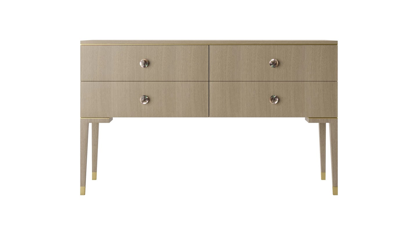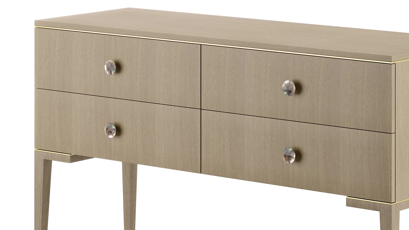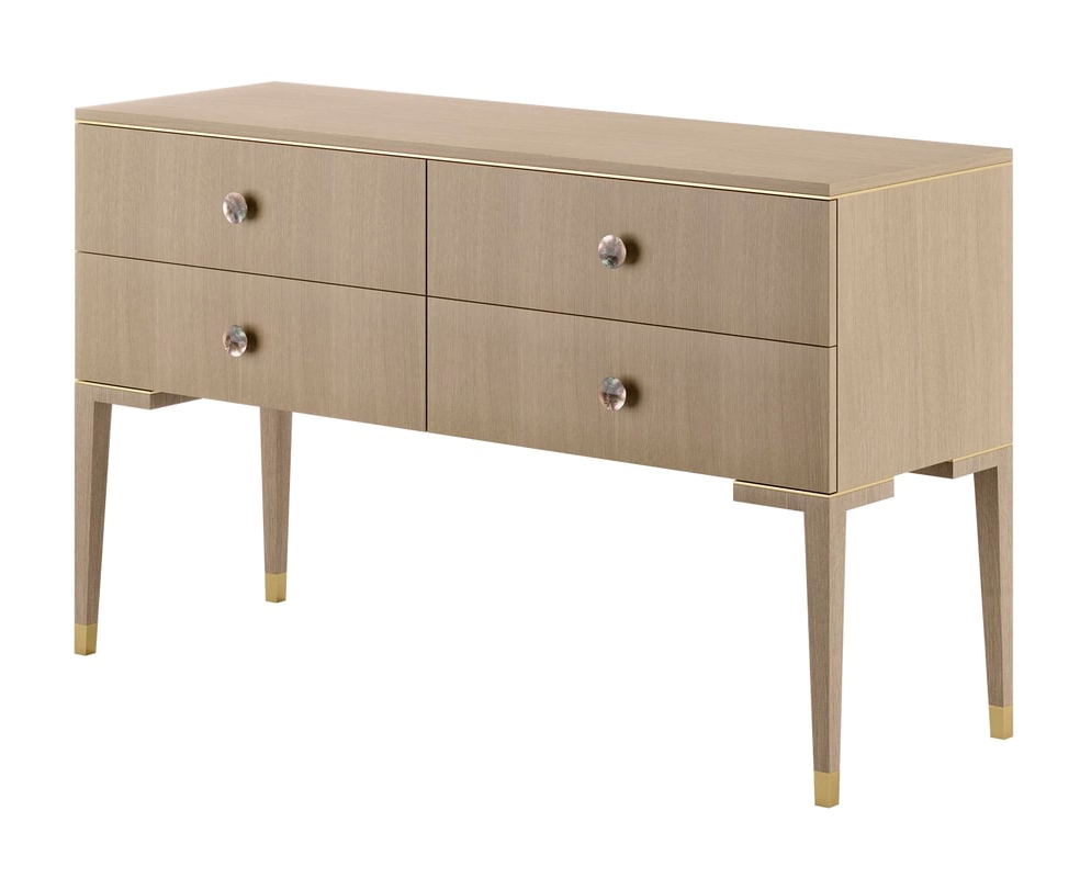 Комод MOONSTONE с четырьмя выдвижными ящиками, являющийся частью коллекции из трех предметов для хранения, отделан деревянным шпоном и дополнен деталями из матовой латуни, которые подчеркивают его утонченный силуэт в стиле ар-деко, а круглые ручки, отделанные черным перламутром, придают завершающий штрих.