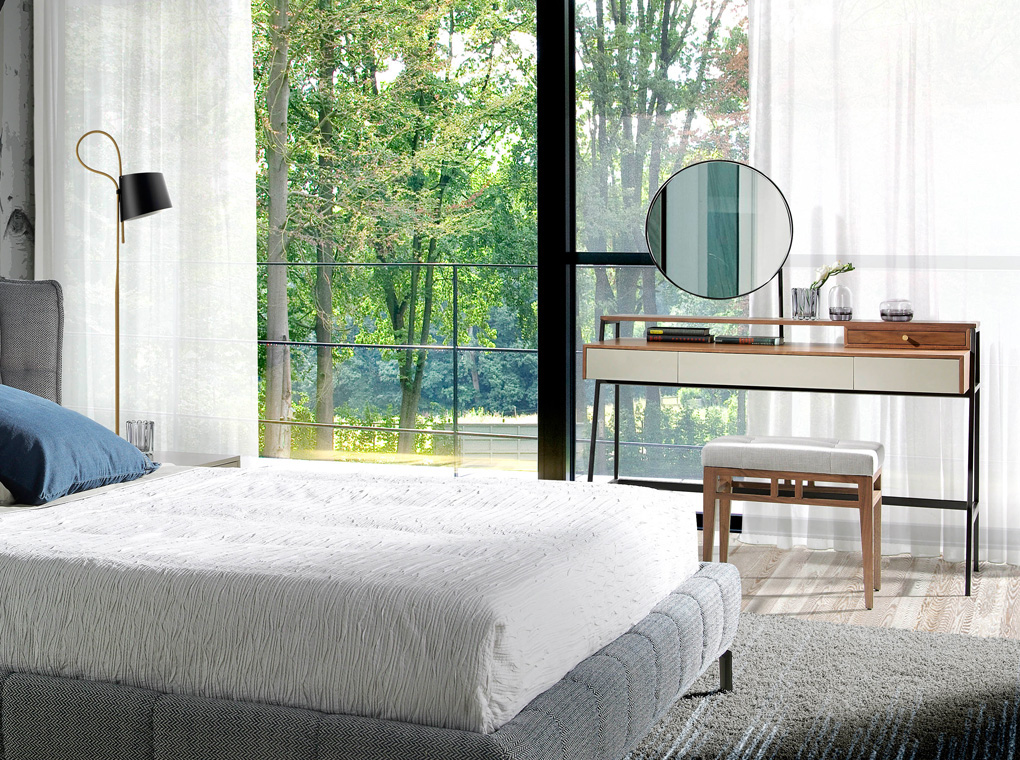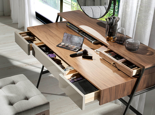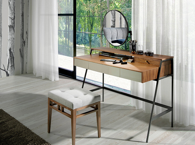 Туалетный столик с зеркалом оригинального современного дизайна из натурального орехового шпона толщиной 0,5 мм и ящиками с лицевыми панелями из МДФ, покрытыми лаком RAL7032 Silk Brillo. Комбинация цветов, которая привносит тепло и актуальность, идеально сочетается с черной стальной конструкцией его ножек. Благодаря центральным ящикам с системой плавного закрывания этот туалетный столик идеально подходит для того, чтобы держать все на своих местах, а также для расслабленного и спокойного наслаждения личным уходом. Утонченный и эксклюзивный штрих, который вы не захотите пропустить в своей спальне. Размеры стола: длина — 120 см, глубина — 60 см, высота — 138 см. Доставка осуществляется в разобранном виде. Инструкция по сборке и крепеж входят в комплектацию.