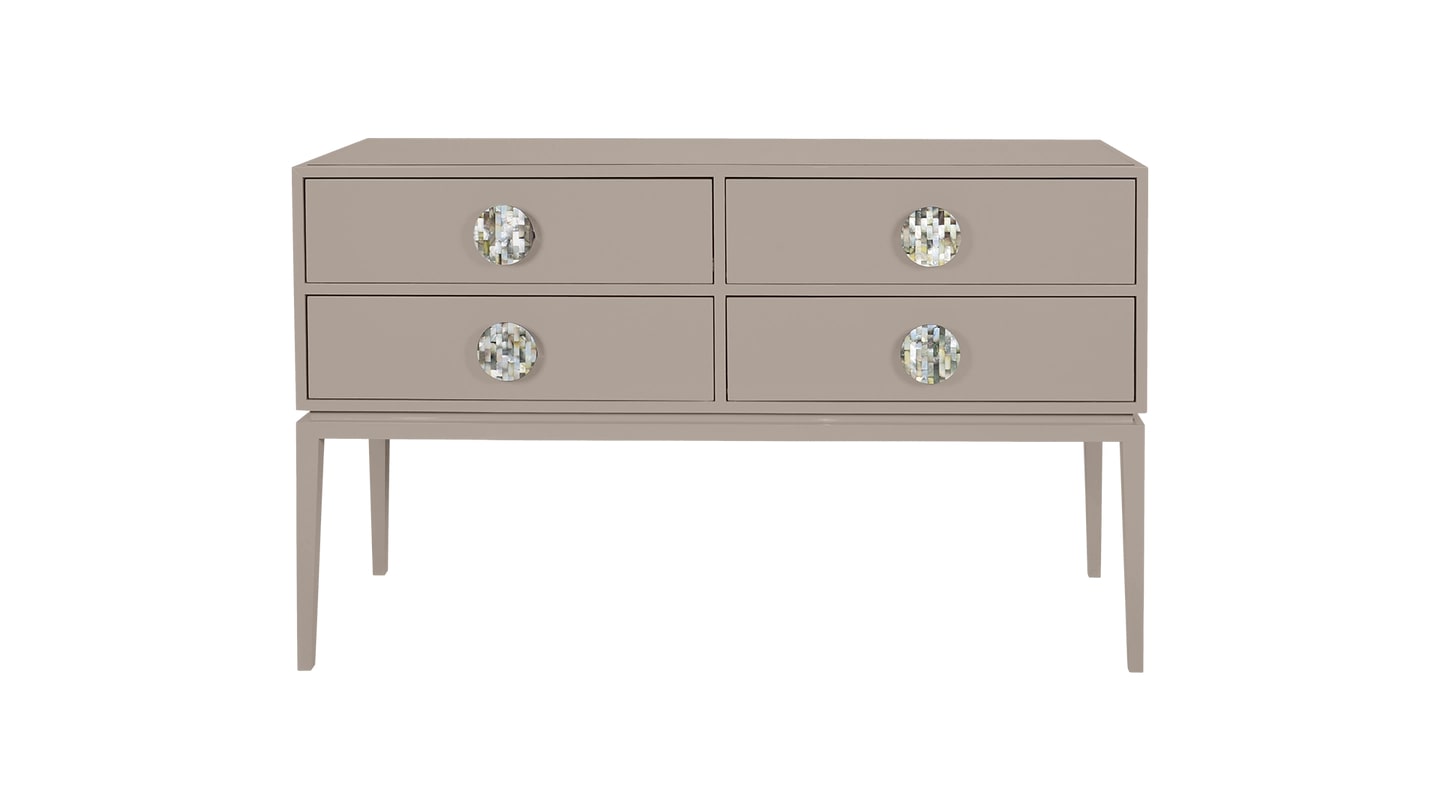 Украсьте свой гардероб с помощью комода GEORGIAN с четырьмя выдвижными ящиками, который придает классическому силуэту свежий вид с использованием современных материалов, включая глянцевую лаковую структуру и бронзовую зеркальную инкрустацию поверхности. Черные перламутровые ручки добавляют завершающий штрих.