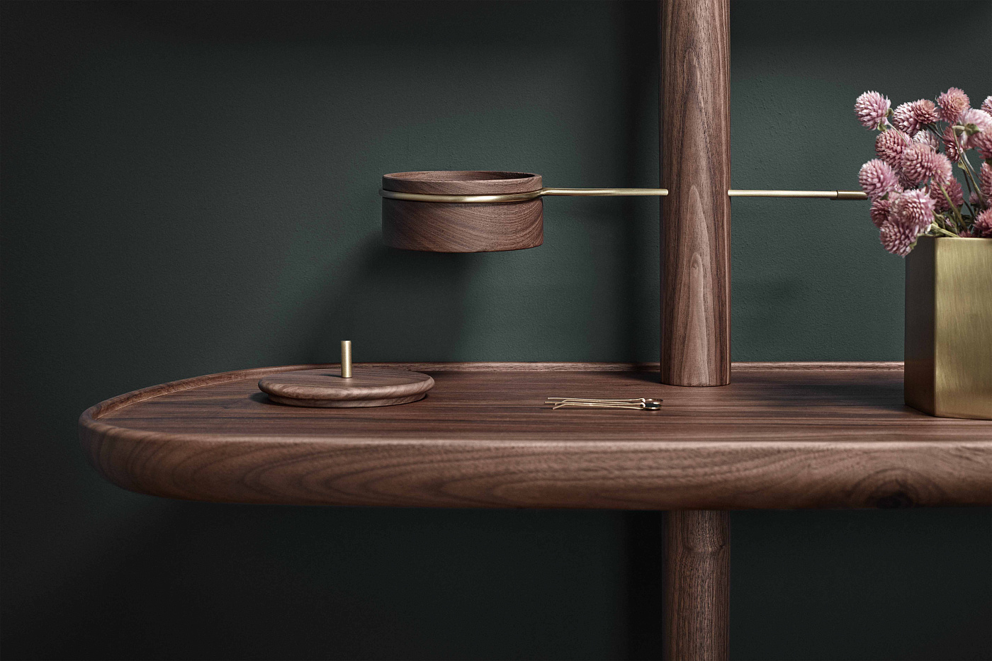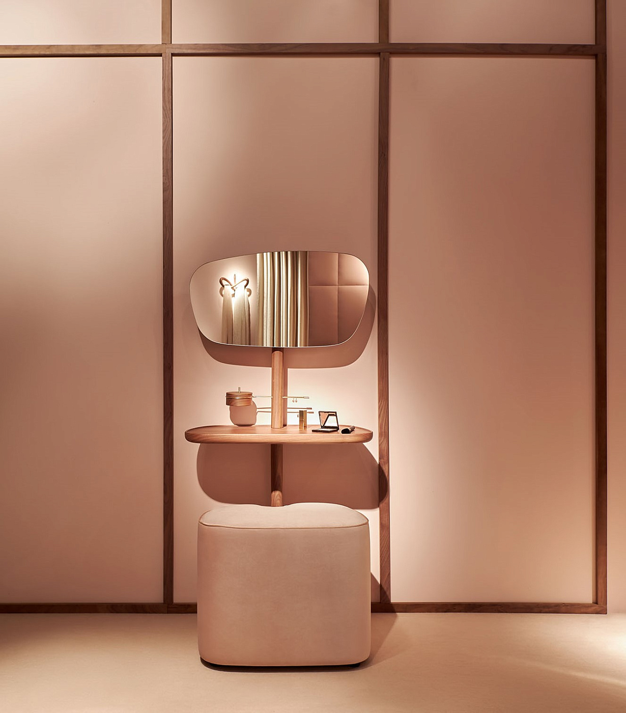 Когда пуф не нужен, его можно задвинуть под столик, в тёплые объятия опоры из массива грецкого ореха. Часть «секретов очарования» можно спрятать в деревянный ящичек, остальное вольготно расположится на широкой столешнице.
