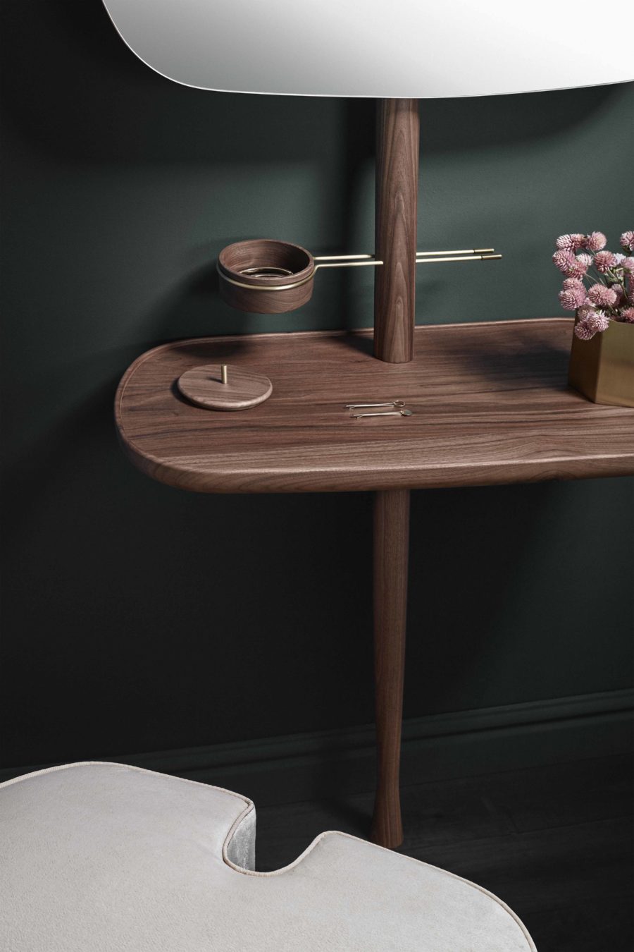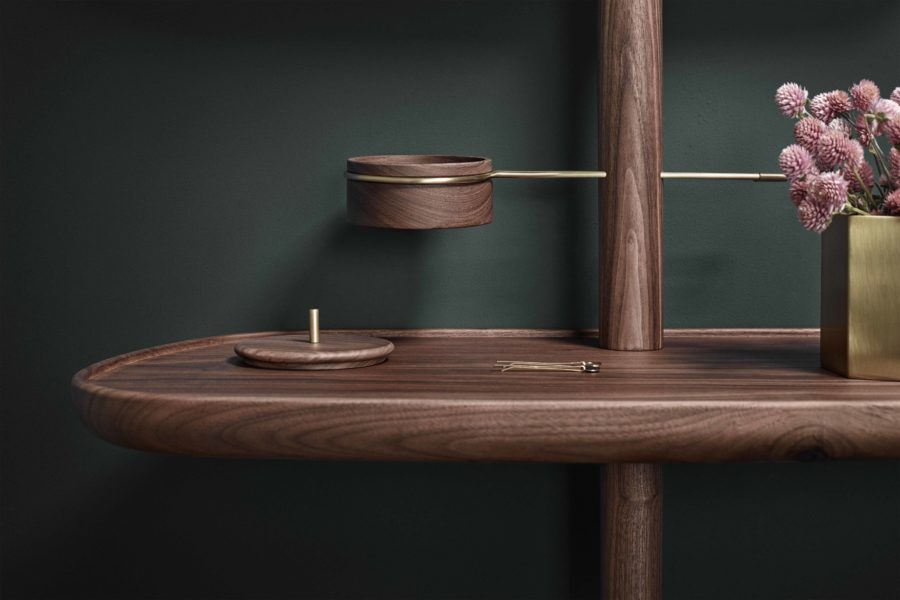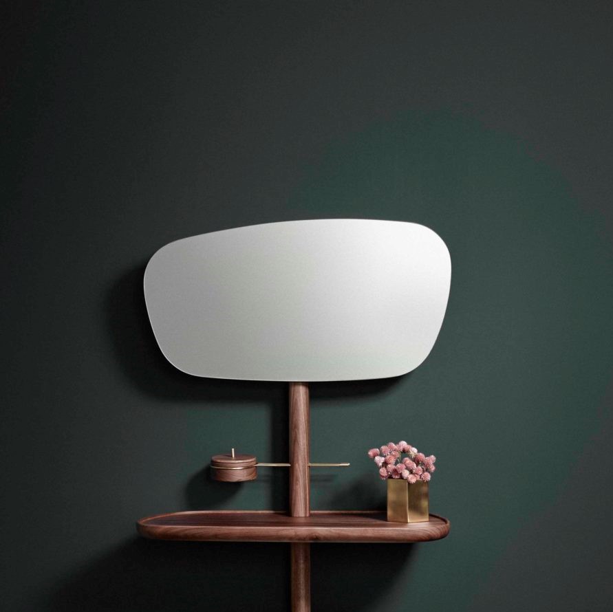 Кажется, будто дизайнер Андрес Мартинез бросает вызов физике, создавая объёмную конструкцию на ножке из древесины грецкого ореха. На самом деле в навесных частях модуля находятся скрытые крепления, надёжно фиксирующие зеркало и полку у стены. Расположение зеркала вариативно: можно поместить его вертикально или горизонтально. Металлические элементы конструкции выполнены из полированной латуни.