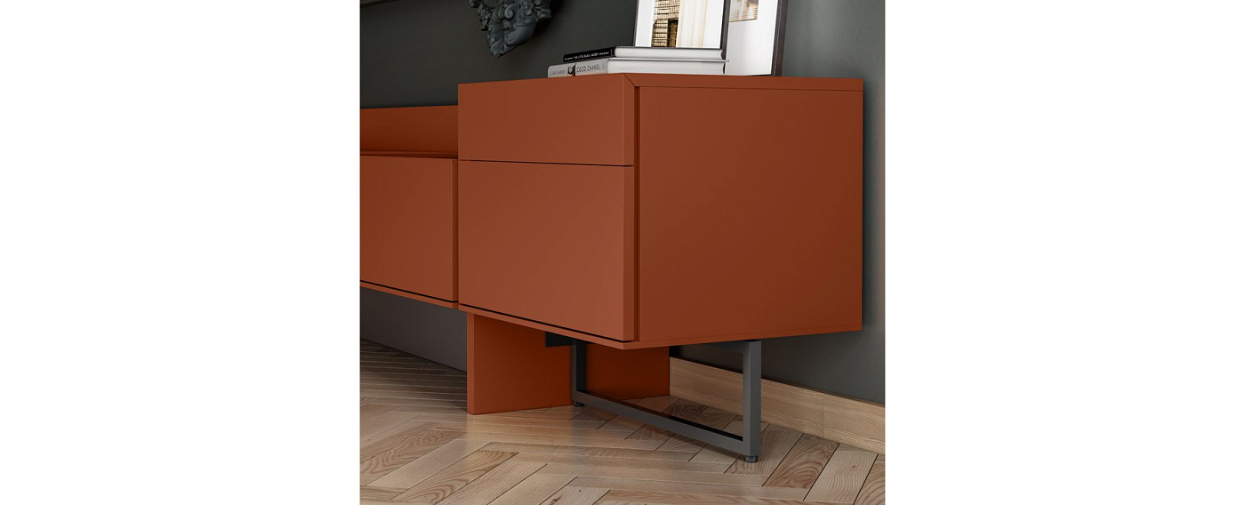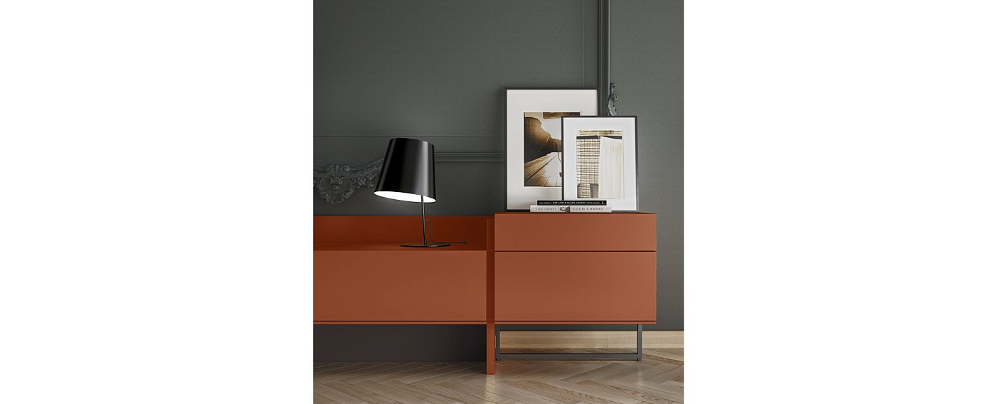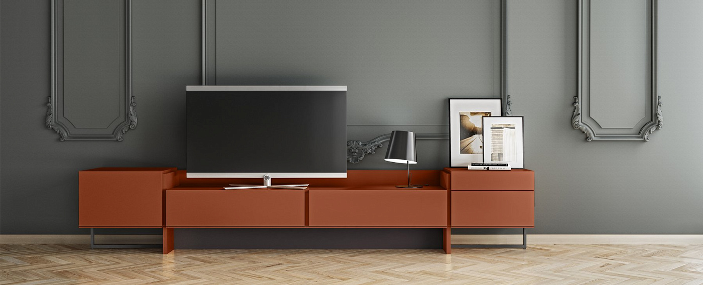 Эта телевизионная композиция установлена на платформе с металлическими ножками. Выдвижные ящики и дверцы составляют низкую корпусную композицию, которая выделяется простотой линий. Модули характеризуются вертикальным направлением облицовки и идеальным соединением под углом 45° между верхней частью и передней панелью. Общая высота композиции позволяет создать минималистскую эстетику, но без ущерба для вместительности.
