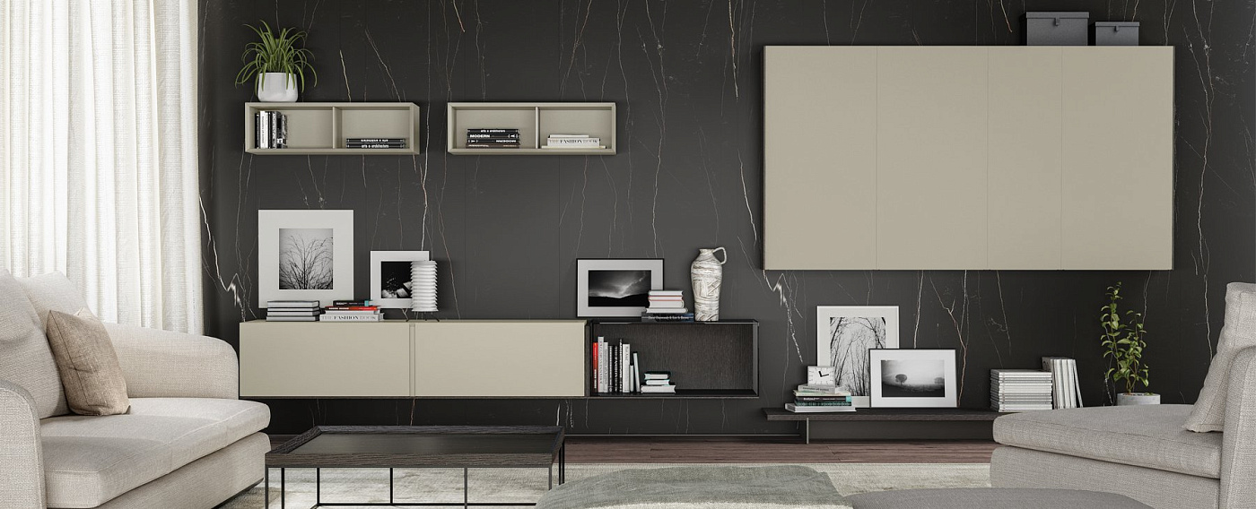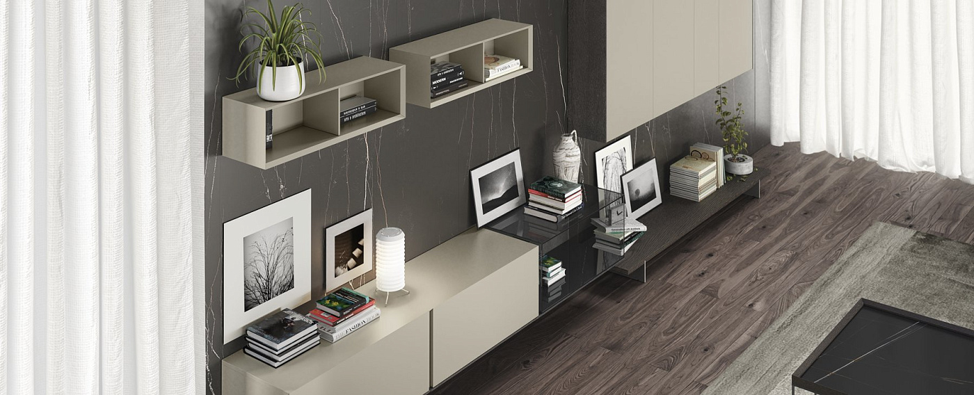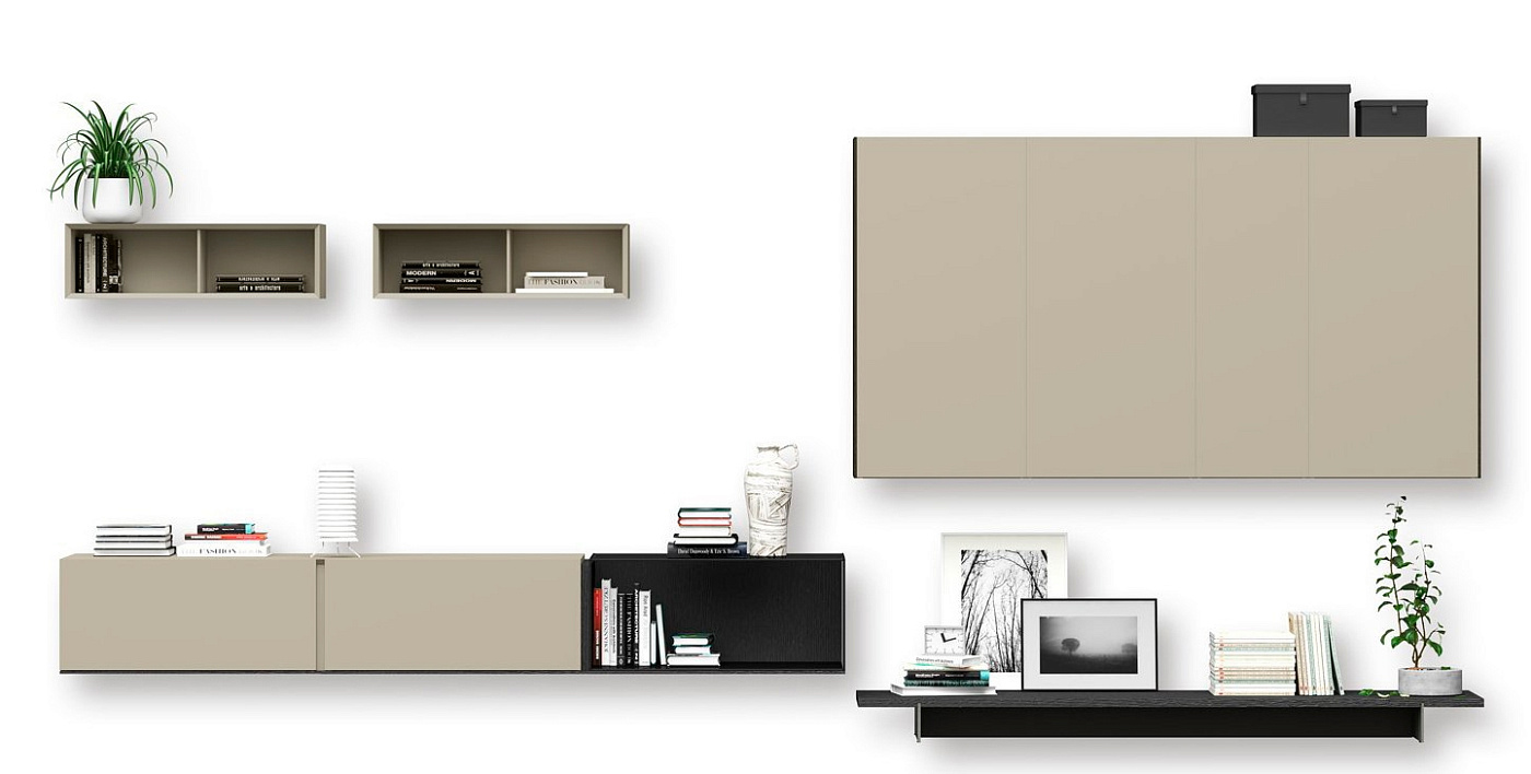 Эта композиция для телевизора подвешивается к стене. С одной стороны, это элементы повышенной вместимости, а с другой - более легкий элемент для размещения телевизора в верхней части. Модули характеризуются вертикальным направлением деревянного листа и идеальным расположением доски под углом 45° между включенным и фронтальным.