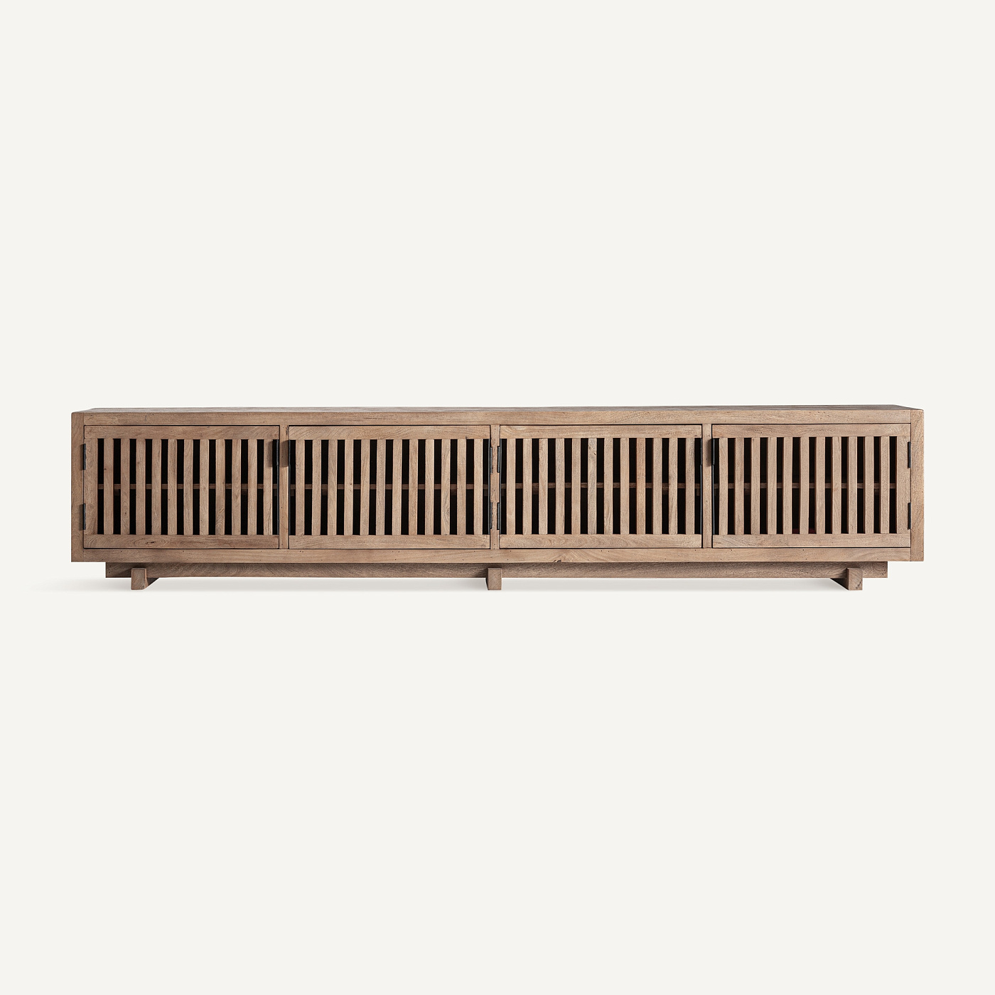 Телевизионная тумба GABIA от VICALDESIGN сочетает в себе технологичность и элегантность. Благодаря своей внушительной длине и раздвижным дверцам с решетчатыми дверцами она обеспечивает устойчивую и комфортную опору, скрывая лишнее и подчеркивая главное. Её умиротворяющий вид гармонично дополняет повседневную жизнь, смягчая даже визуальное воздействие экранов, создавая уютную и гармоничную атмосферу. Ширина: 253 см, Глубина: 45 см, Высота: 54 см