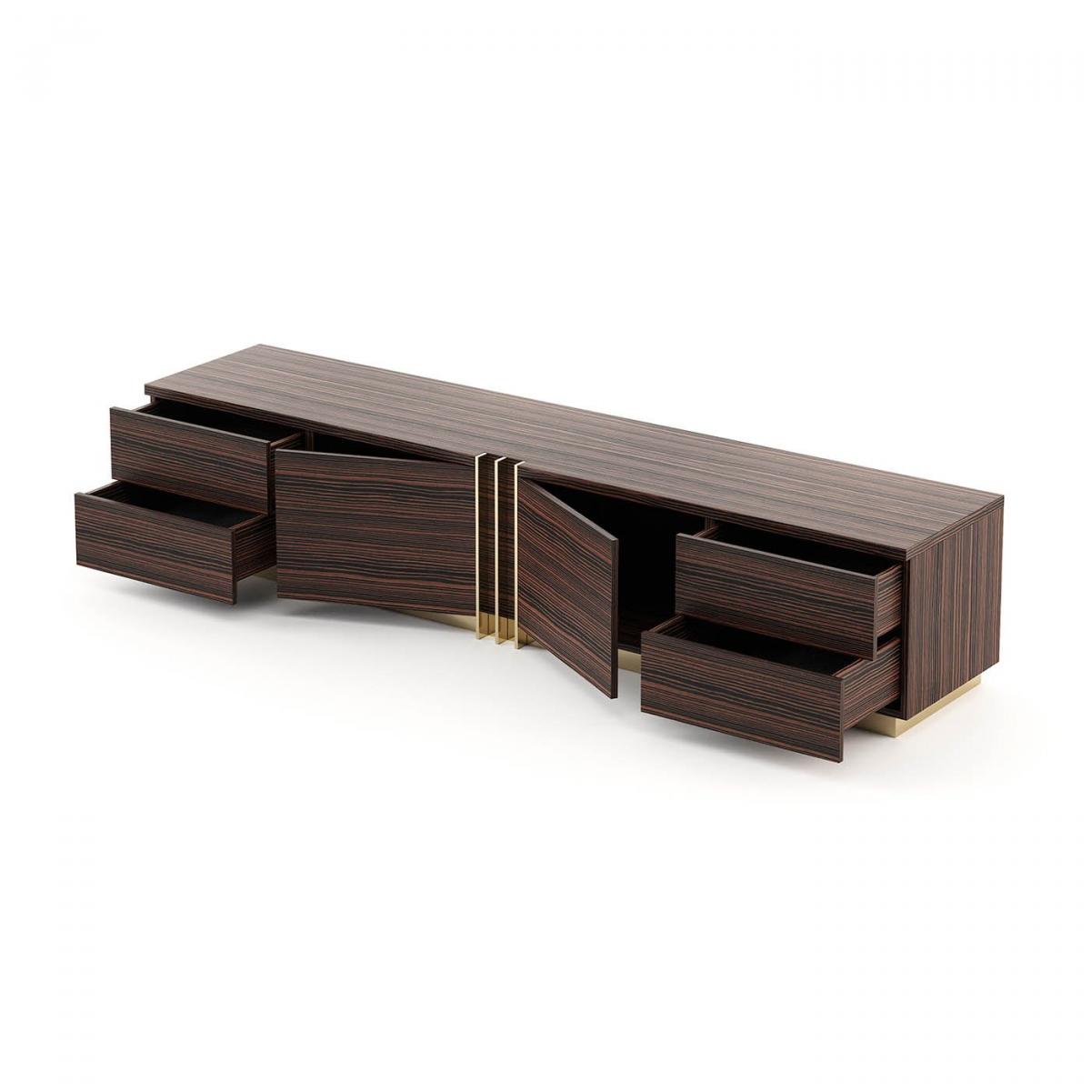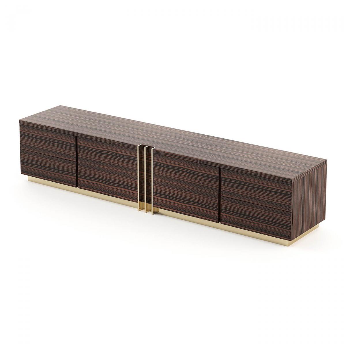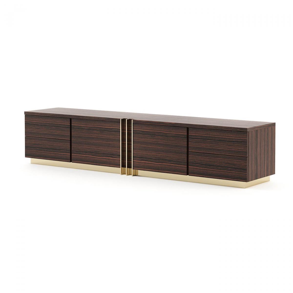Тумба под телевизор из коллекции D’Arc, представлена здесь в глянцевой отделке эвкалипта с акцентами медного цвета из нержавеющей стали. Изделие он создает атмосферу роскоши и яркости, и может сочетаться с любым стилем декора.
