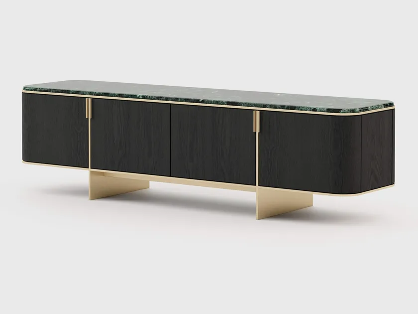 Тумба под телевизор Dean – это изделие в стиле 50-х готов, которое источает шарм. Великолепная столешница из полированного мрамора поддерживается деревянной структурой. Золотистая нержавеющая сталь придает этому изделию роскошный вид и создает сбалансированный контраст с темным деревом.