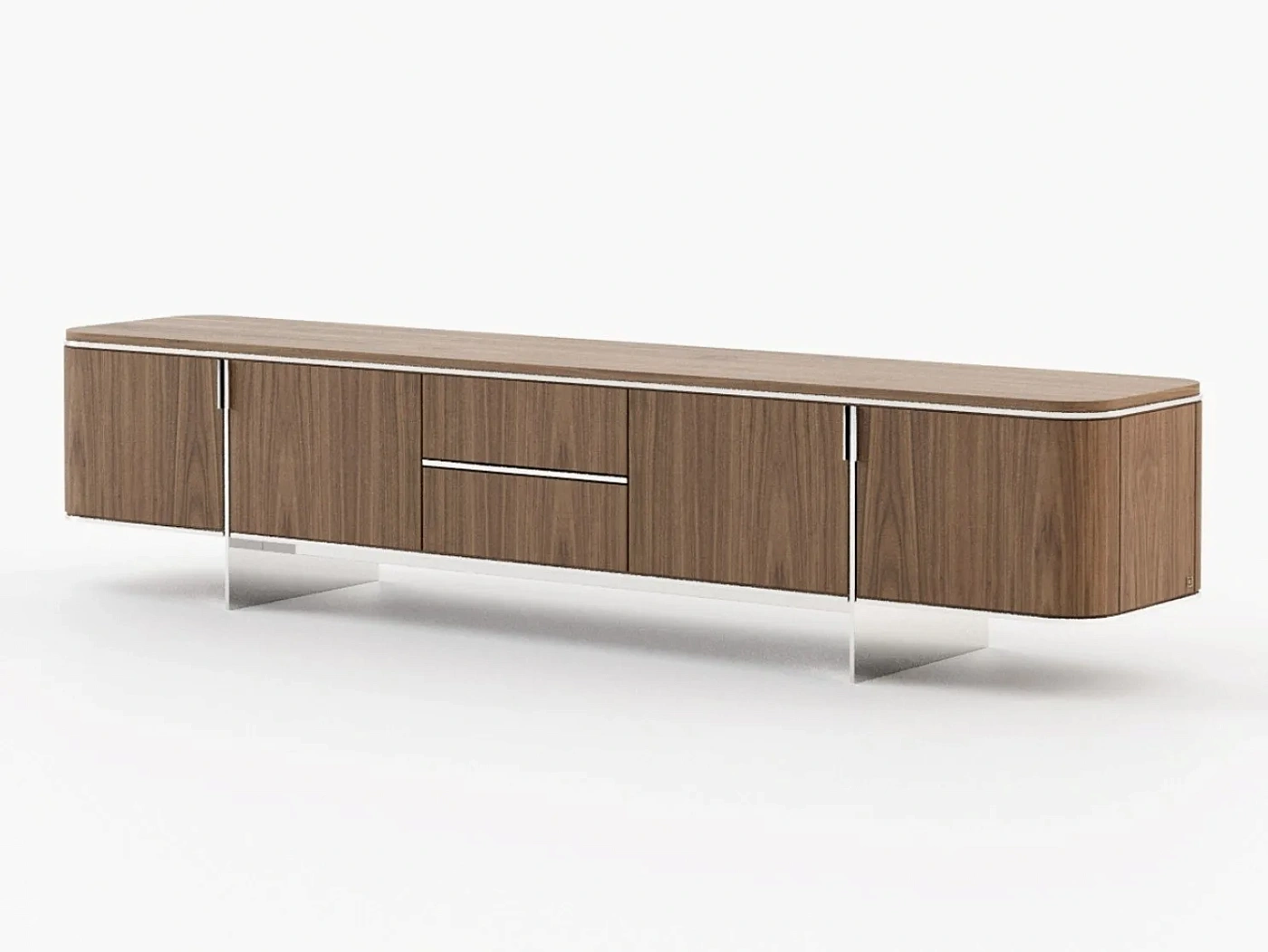 Тумба под телевизор Dean – это изделие в стиле 50-х готов, которое источает шарм. Великолепная столешница из полированного мрамора поддерживается деревянной структурой. Золотистая нержавеющая сталь придает этому изделию роскошный вид и создает сбалансированный контраст с темным деревом.