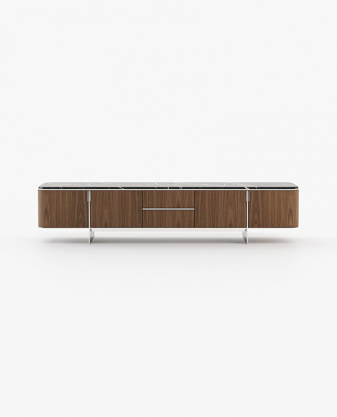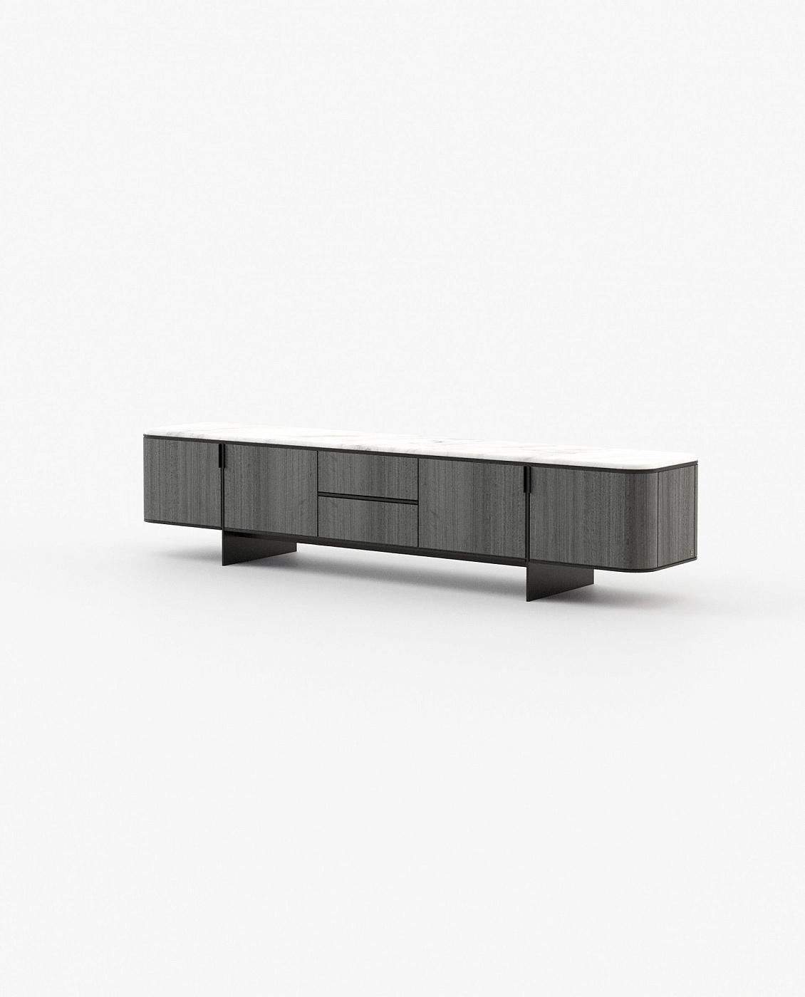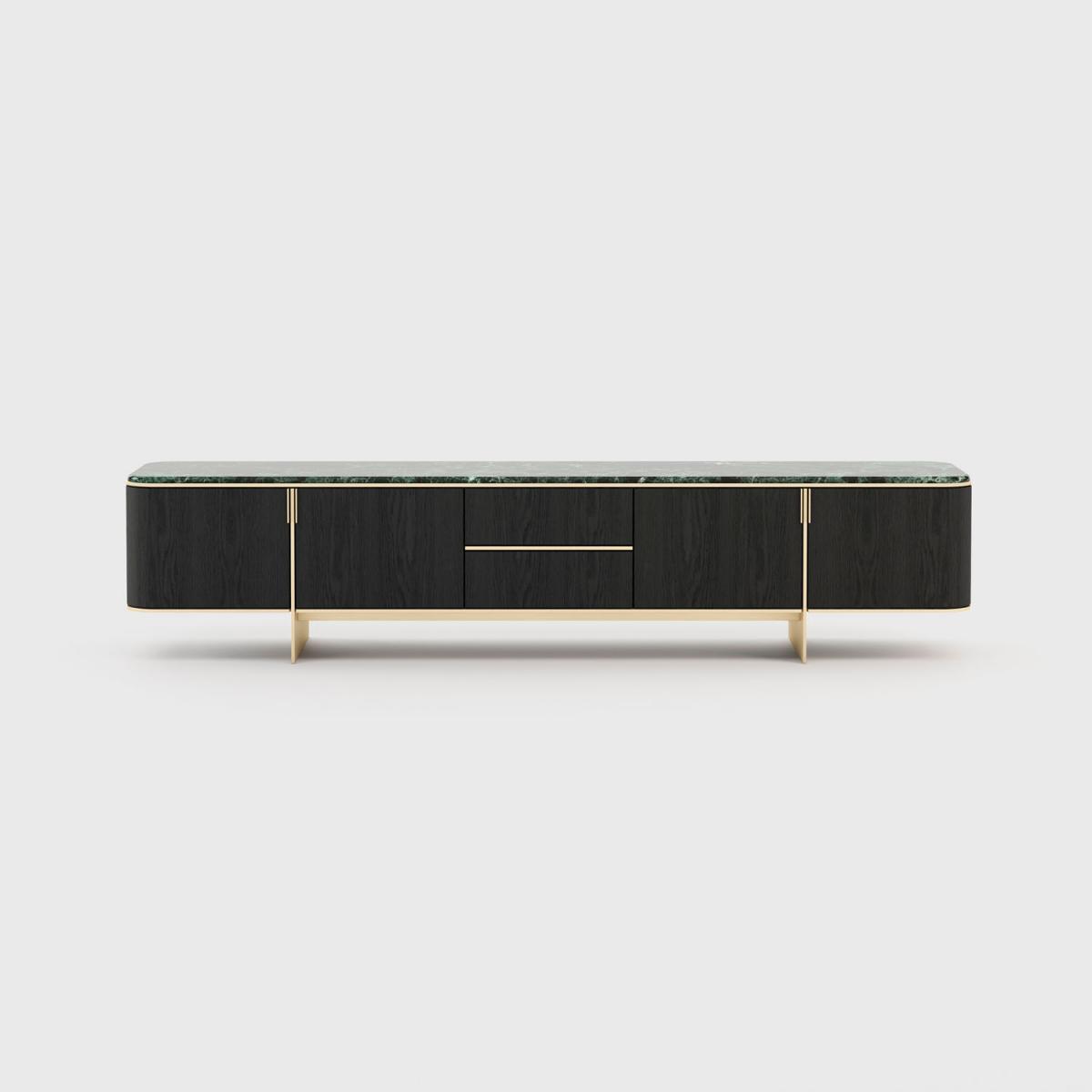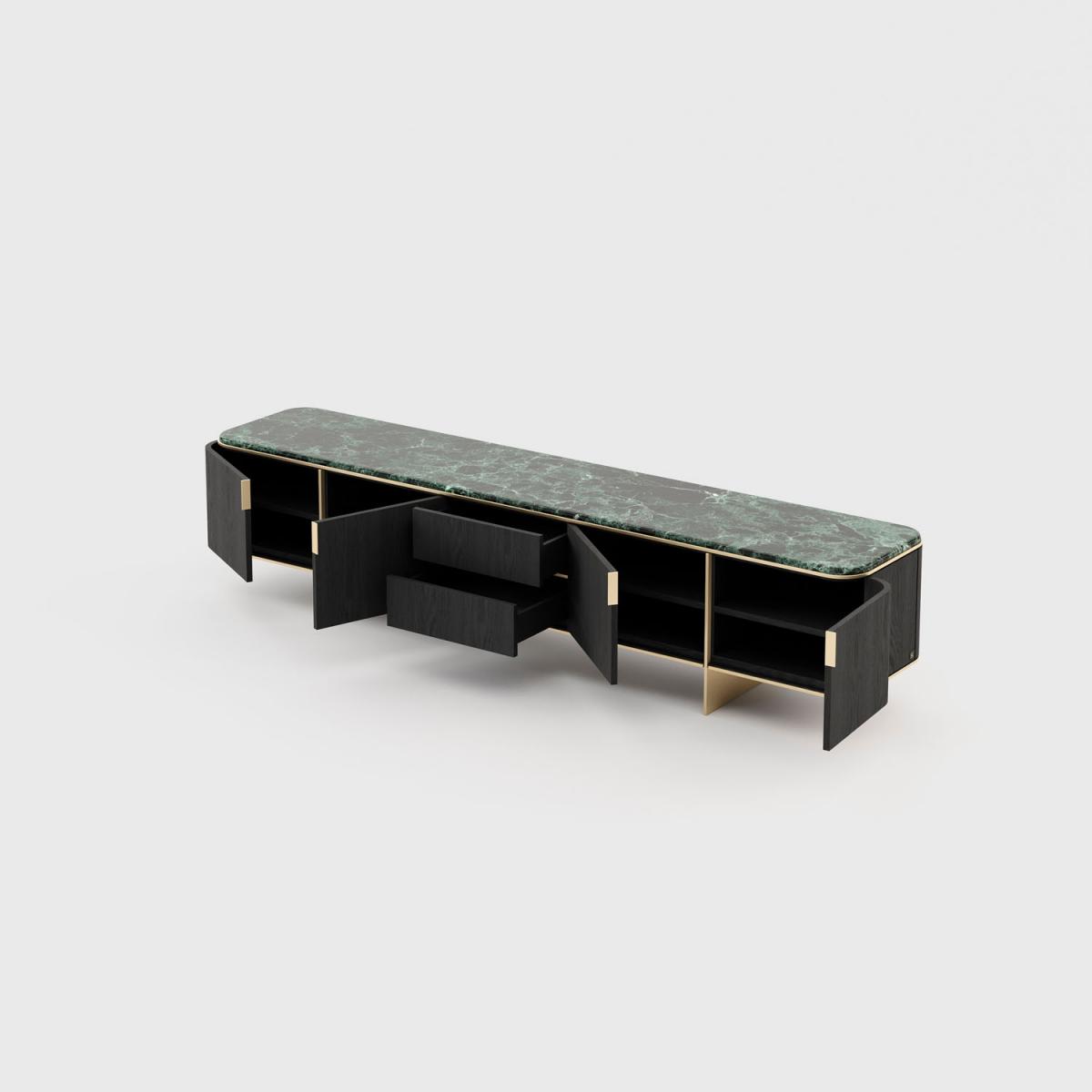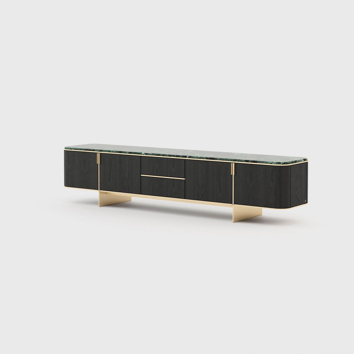 Тумба под телевизор Dean – это изделие в стиле 50-х готов, которое источает шарм. Великолепная столешница из полированного мрамора поддерживается деревянной структурой. Золотистая нержавеющая сталь придает этому изделию роскошный вид и создает сбалансированный контраст с темным деревом.